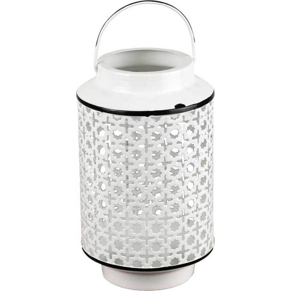 Sophisticated in design and concept this metal crafted hanging lantern has the best of metal craftsmanship along with a sober colour effect making it virtually as modern and contemporary as it is retro and classic. Its height of about 20 cm makes it perfect for placing a tall candle within while its 12 cm diameter gives it a solid chunky look. Could be placed next to votives and candle stands in different colours and designs or maybe placed in the outdoor, its picking and carrying being rather easy due to the handle that is fitted to its top. The rim in black at the base and the top makes its design stand out more vividly. The white colour will make it look as pleasant in the morning when it is not aglow it a different sort of beauty. The Lantern Quatrefoil design is from an ancient inspiration of designs that has been seen on ancient artefacts and murals. Make the mood of any space come alive with a different feel.