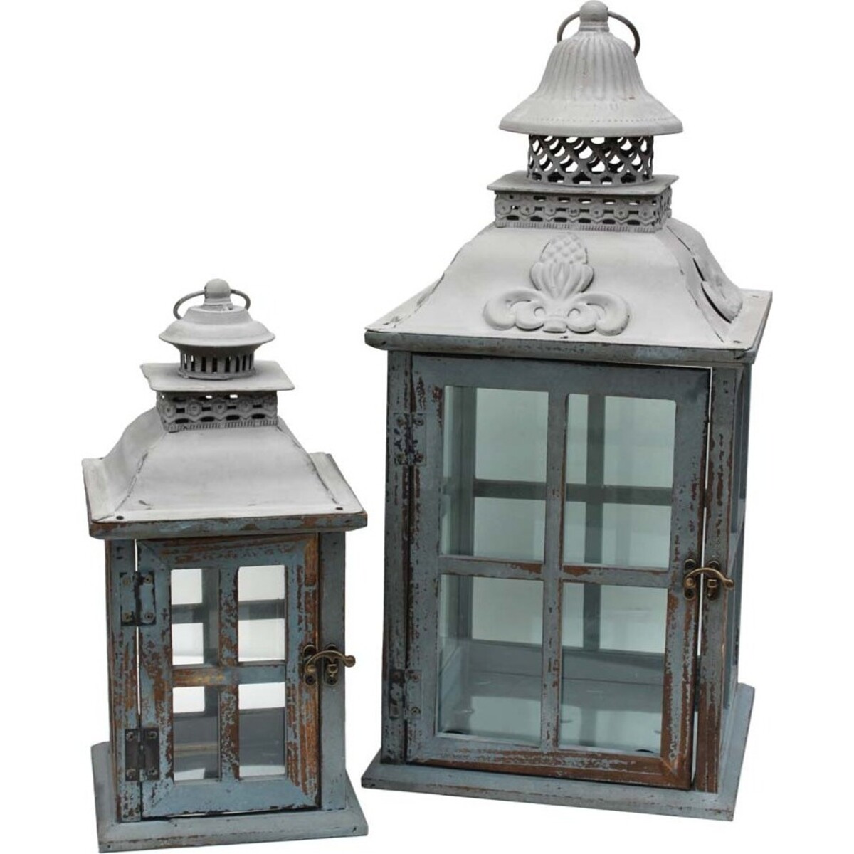 The large and small candle holder are almost identical in appearance and complement each other beautifully. The gray base of each is worn down with brown to give it a weathered appearance. A latched door opens in the front to allow each access to the inside. Panes of glass on all sides allow users to see all the way through and permits sunlight or candlelight to permeate the product without disruption. The top of the lanterns are three tiers, each with their own intricate design that really brings life to the piece. The top of the large candle holder has a fleur de lis style design on each side. A ring attached at the top allows for easy carrying or hanging. Candles are not included with purchase.