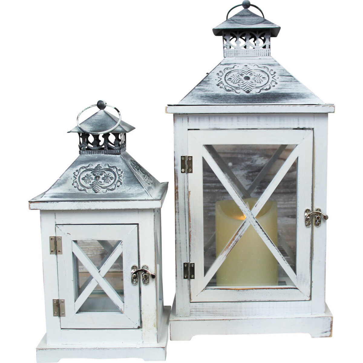 The set of lanterns comes in two sizes both with the same design-made from MDF, metal and glass and capable of holding pillar candles inside, they are stunning in their ability to light up larger spaces-. Keep them in the lawn area when the party moves outdoors in summers, or simply let them light up the entryway of your home when it's a d]festive dinner you are hosting and adding the warmth of candlelight is on the cards, the rustic chic look of this set of lanterns will be such welcome change for the typical lighting we have around us. Helping soften the lines and making ne bask in the glow of soft lighting. While the larger lantern is 50 cm tall the smaller one is 35 cm in height and thus, they make quite a stylish splash in your décor adding to the look of modern chicness through their rustic antiquity. The wood and metal has been coloured in such a way that the distressed painted look comes through vividly. A wonderful alternate lighting option that will make all the difference to your décor.