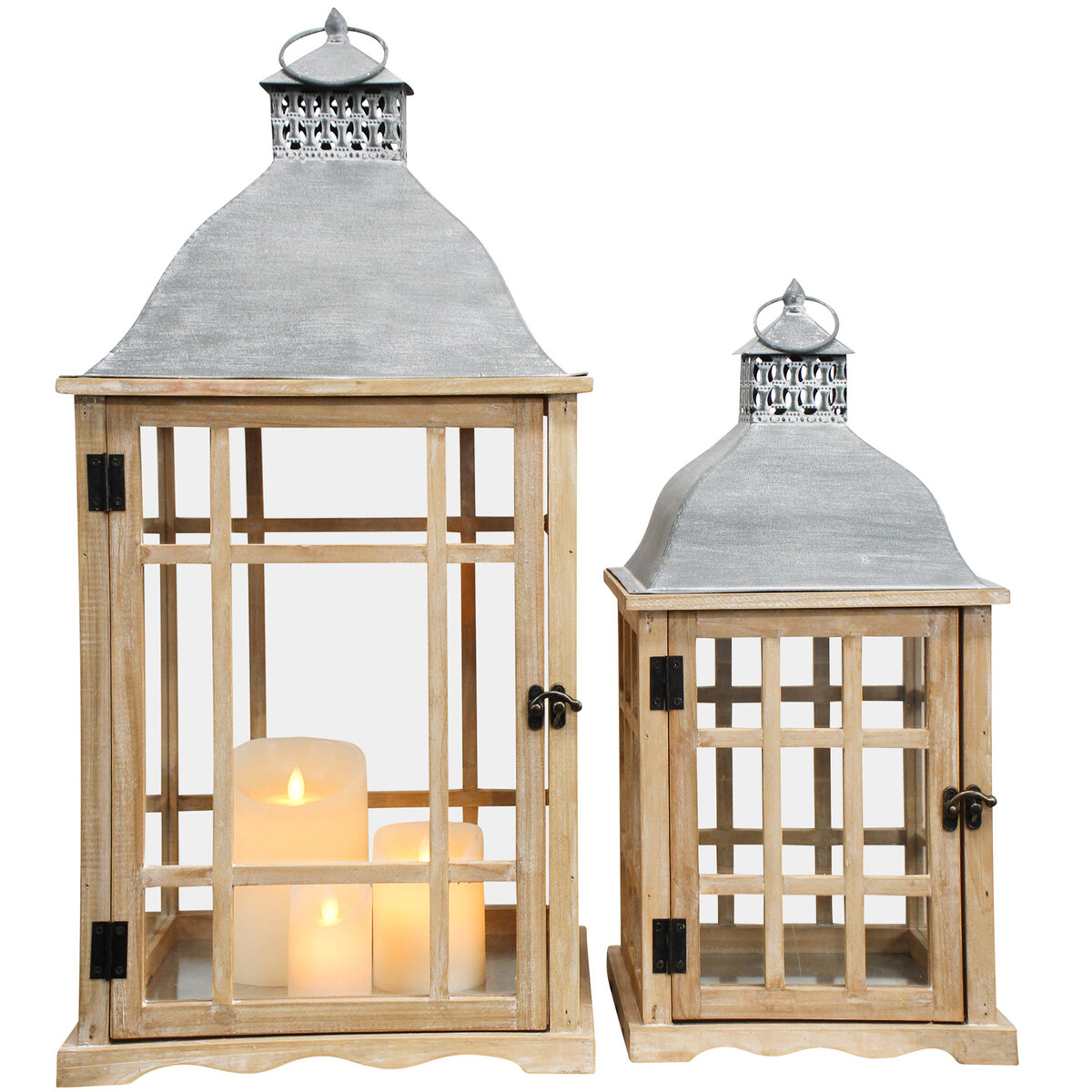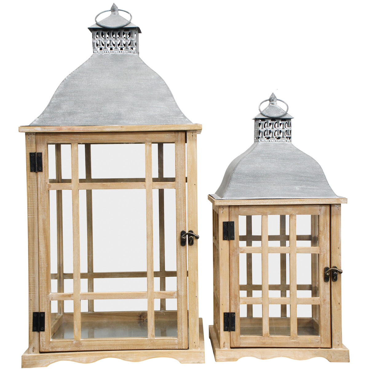 Both lanterns in this Lanterns Ventana Set/2 can comfortably contain at least 3 candles each for the perfect, illuminating candle lighting experience. In fact, the bigger variant can contain up to 5 differently sized candles all at a time. The small variety has a dimension of 24 centimetres in breadth, 24 centimetres in length and 49 centimetres height. The larger variant on the other hand, measures 32 centimetres both in length and also in breadth while standing at an impressive height of 61 centimetres. Both sizes are made in similar design featuring the use of the best metal and wood.