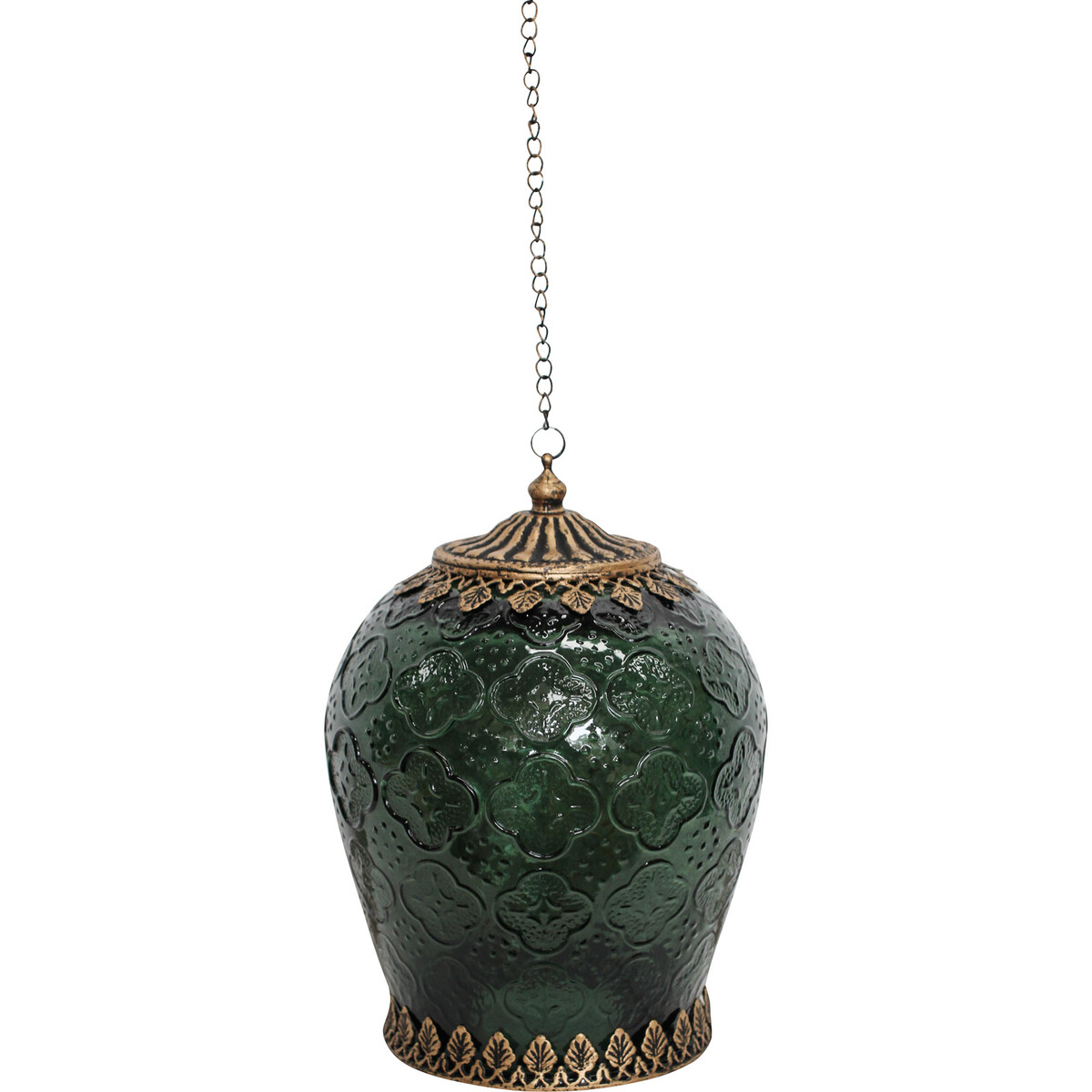 Light plays out its role in the most stunning of ways when used in the right proportion using the right medium and pendant lamps are truly a special means to do so. Hang this from the chain it comes from and let it light up a dining table or a console-a corner or any passage with its subtle lighting. The glass made curved shade has a gorgeous rich colour in green with a traditional embossed pattern adding a stunning antique appeal. Has multiple means of display anywhere you wish to highlight or illuminate to bring in a subtle depth and focus, in your décor. Gives you a cozy kind of ambience whether placed up on the dining table or in your bedroom. The dome like shape has a metal frame on top and the edges in a leaf pattern in dull gold adding to its rich mid-eastern appeal.