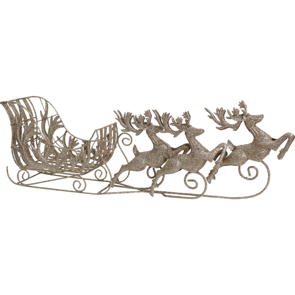 Even the most aesthetically uncreative of your customers would be drawn by the charms of this Large Gold Reindeers and Sleigh given its splendid crafting and irresistible ornamental appeal. Composed of a beautifully crafted sleigh being drawn by three energetic and enthusiastic reindeers, it certainly makes a bold visual statement which many would find magical especially in relation to the decorative activities for this forthcoming Christmas celebration. Both the intricately crafted reindeers and the sleigh are all made through the use of premium quality metal material before being sequinned to a glittering finish!