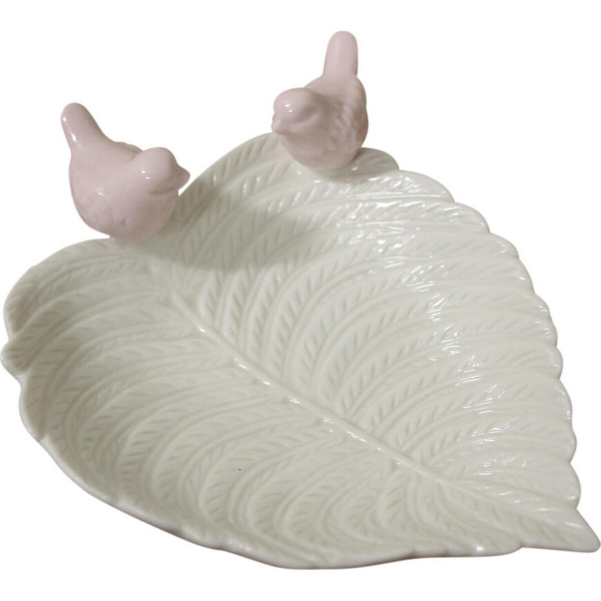 A platter made of ceramic with such detailing makes for a beautiful display piece. The fine quality of the ceramic crafting is obvious in the sheen and the colour that has been created in this piece. The two birds sitting at the edge adds the detailing. Delicately detailed, the venations on the maple leaf, the tiny warping of the leaf in places in the most natural way - all of this makes the 15 cm long leaf with its 13 cm width, makes for a superb example of how an inspiration from nature can be given the most imaginative of looks. Use this to serve finger foods, place floral displays that are small including candles like any centrepiece or use this like you would a trinket tray. Placed anywhere it is bound to create a beautiful spot of interest and help soften the look of that space. Inspired by nature but perfected like an artform by expert hands, this delightful combination of subtle colour and form in the best of handcrafted ceramic makes for a great accessory in the serve ware section of your home.