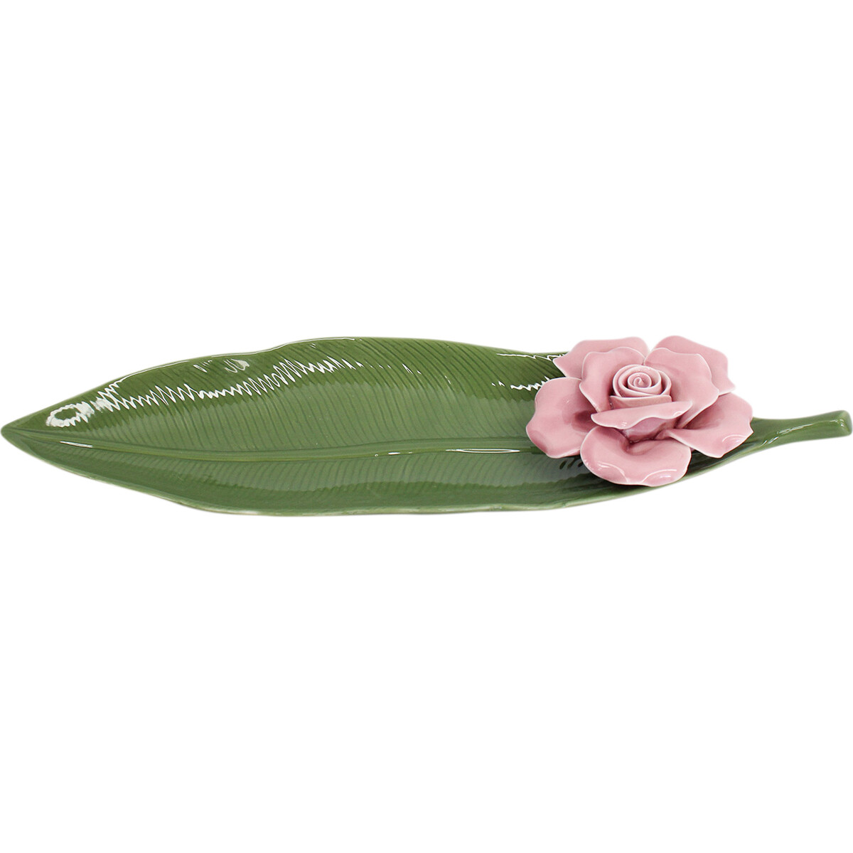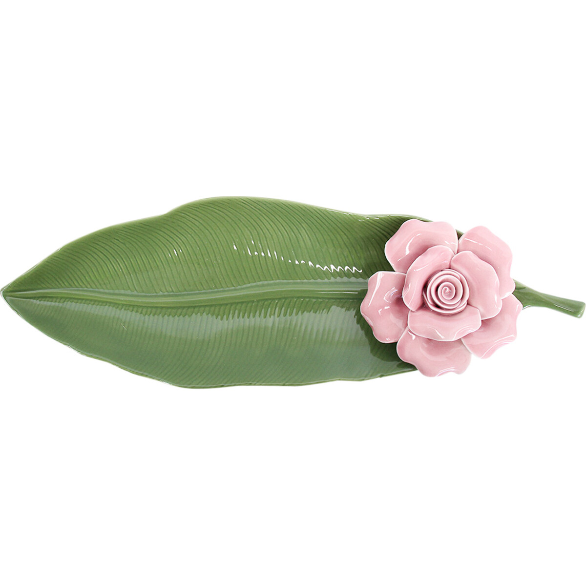The Leaf Plate Dainty Green is made of high quality ceramic material which has been fired to such extreme temperatures inside the kiln in order to produce a décor object with uncompromising quality. Shaped in the form of a long, wide leaf, it is then glazed in bright forest green colour which would blend in seamlessly into most decorative setup your customers may already have. The green, glossy leaf is further ornamented with a rose flower pick glazed in rose shade of pink.