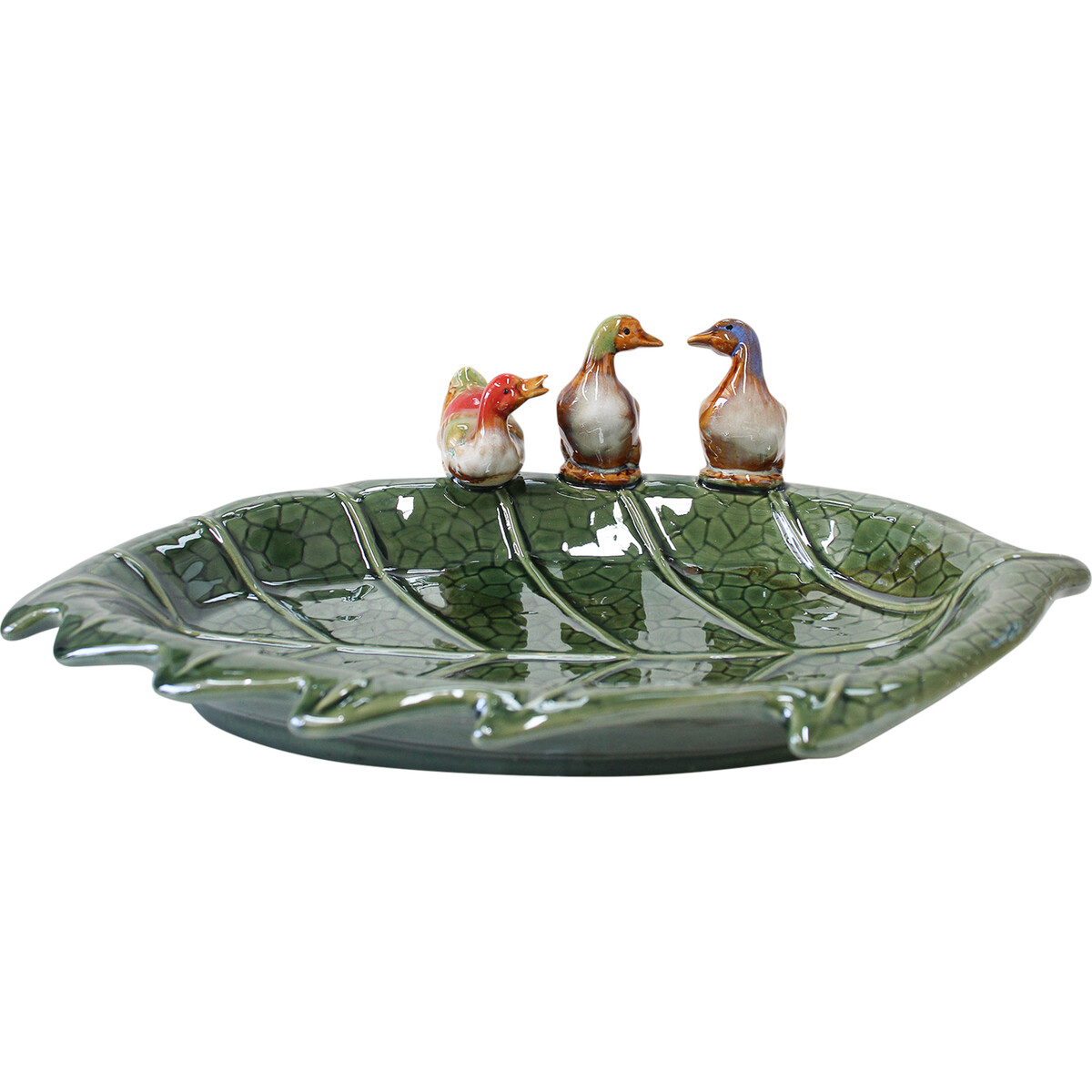 This is an indispensable ware perfect for show-offs to impress guests. This plate will brighten up the dining setting and take the dining experience to the next level. Leaf Plate Lrg w/ Ducks is highly styled and perfect for miniature cabinet displays. This ceramic piece features a shallow depth and slightly raised edges. It is portable. It is portable for serving desserts and sliced fruits to the guest. Use this plate on a nightstand to hold snacks, fruits, or beverages for late-night snacking. Entirely made from ceramics, a sustainable material that is lightweight despite its durability.