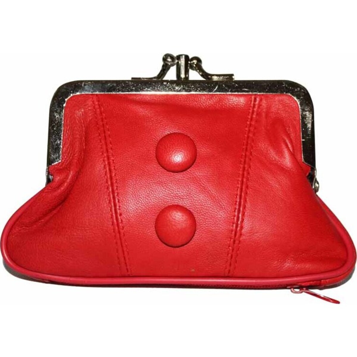 This is a red leather clutch decorated with two large buttons of the same colour on the front of the purse.