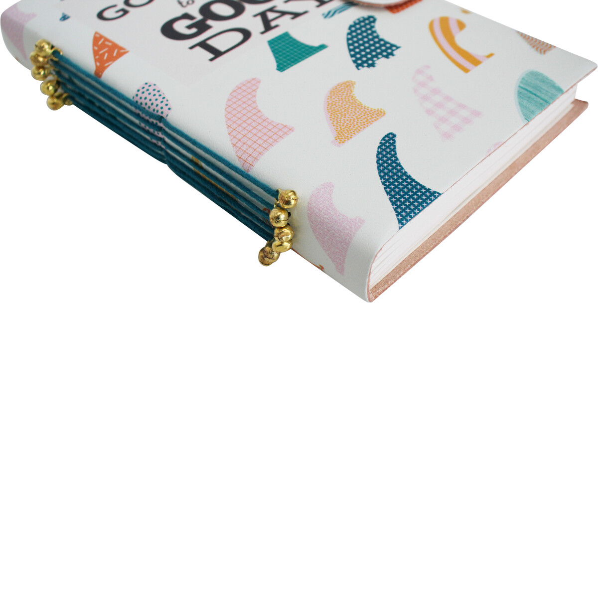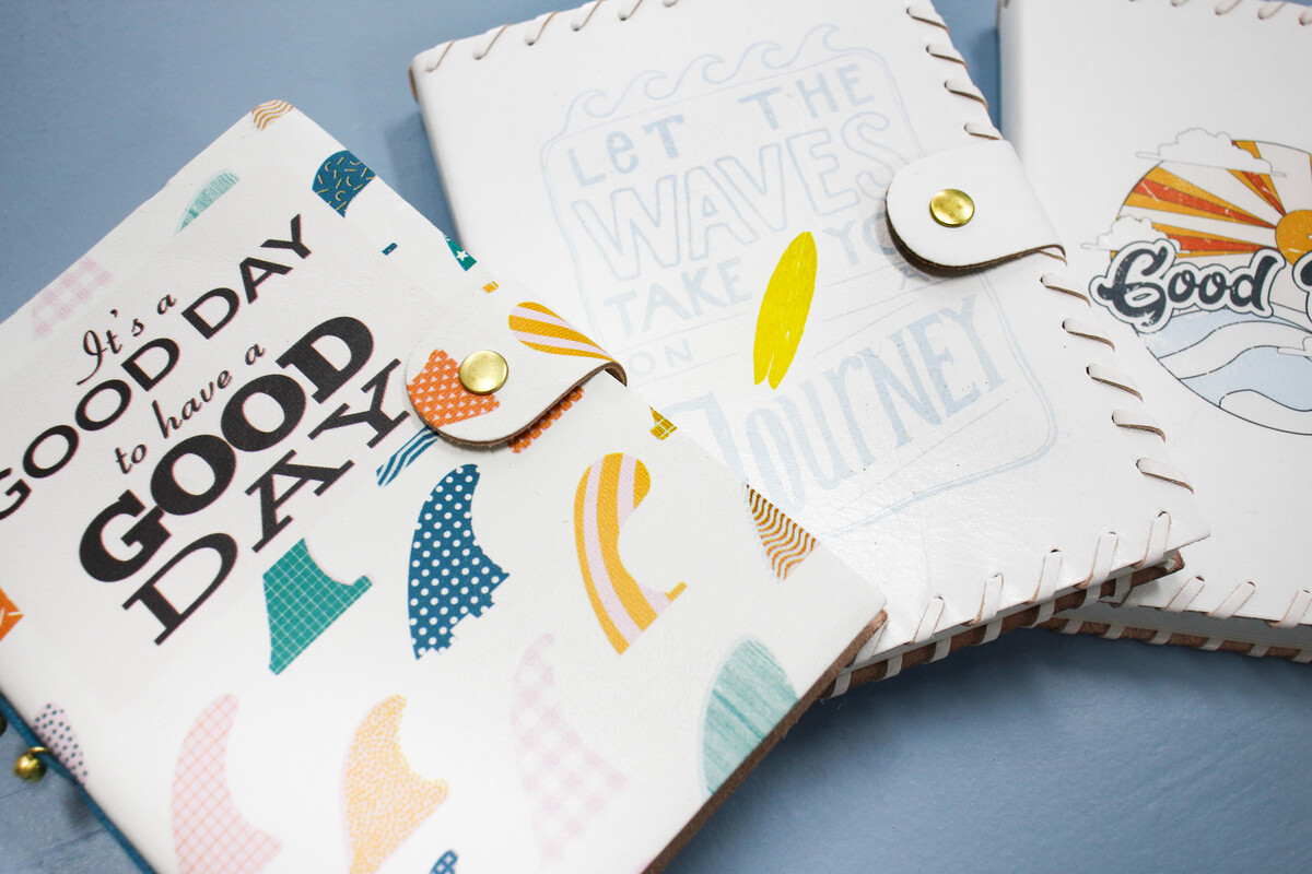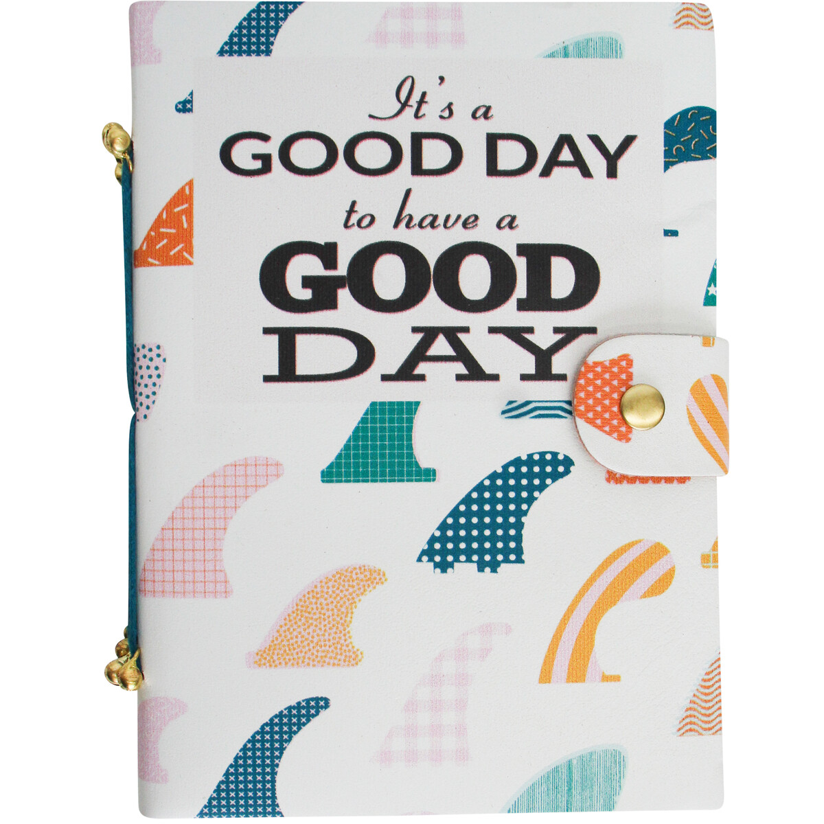 The Leather N/Book Colourful Fins can be deployed for use in a variety of ways. It would be suitable for use in taking religious notes such as in churches, academic notes such as in schools, business notes such as in your shop, formal notes such as in offices, personal notes such as a dairy, and a host of other instances. On the ornately decorated leather back are the words "It's a GOOD DAY to have a GOOD DAY". The sheaf of paper notes are held together by strings which are further held together by gold coloured metals at the back.