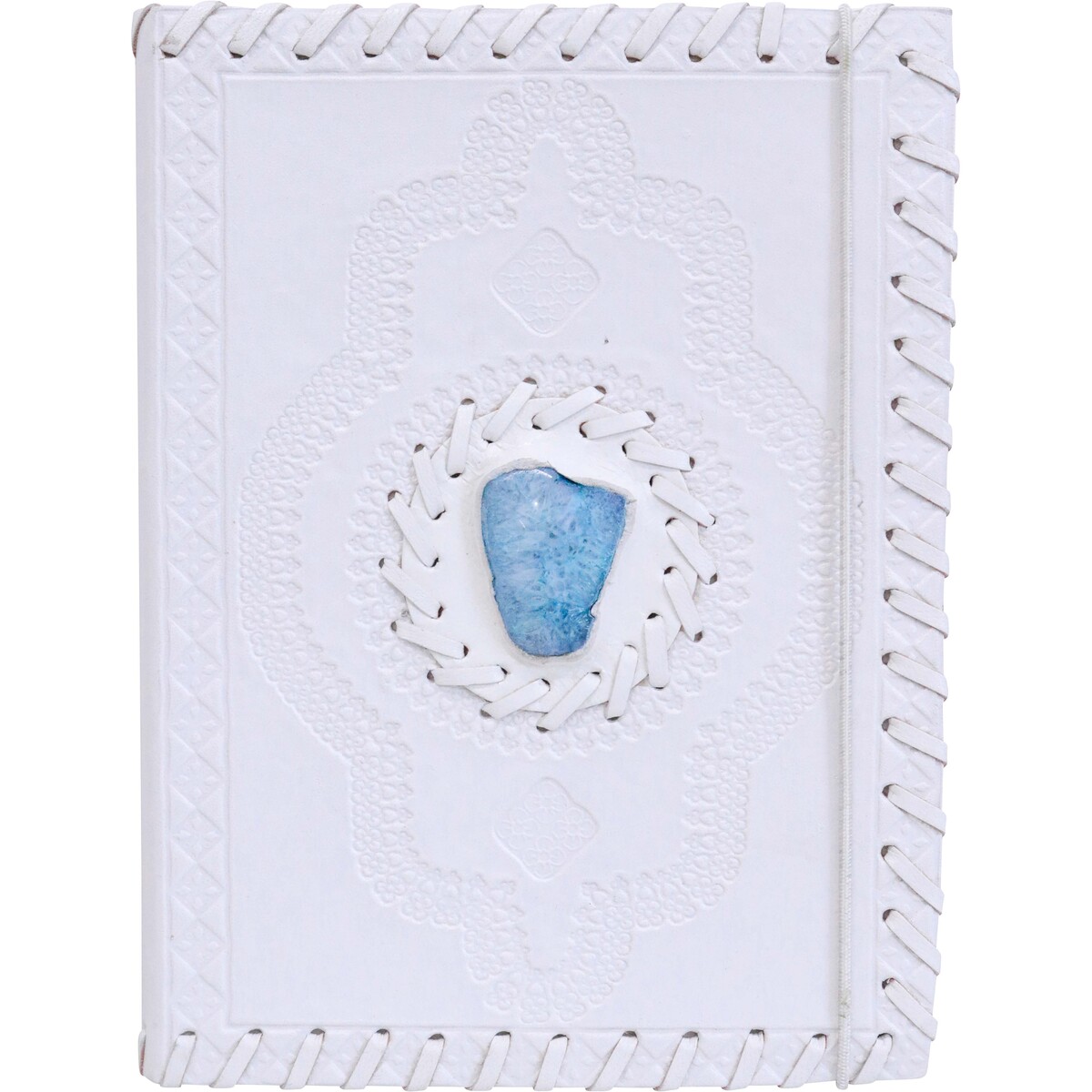 Our Leather N/Book Blue Gem. Now there’s a notebook that doesn’t really look like a notebook. This little 18x13cm beauty - we can call it a journal, really - is something that customers will be picking up again and again. Even people who don’t usually write or keep records seem to love the look and feel of this one - and we think it’s because it reminds them of what they could be doing with their time - dreaming, thinking, keeping notes or even just scribbling. It doesn’t matter what someone decides to use it for - this white leather, blue-gem adorned “book” is more than that - it’s about giving your customers ideas about what they could be doing more of. Writing, reading or just being more intentional with their time. And can we add that leather cover is simply stunning? The blue gem does something really magical to the cover - it’s eye-catching.