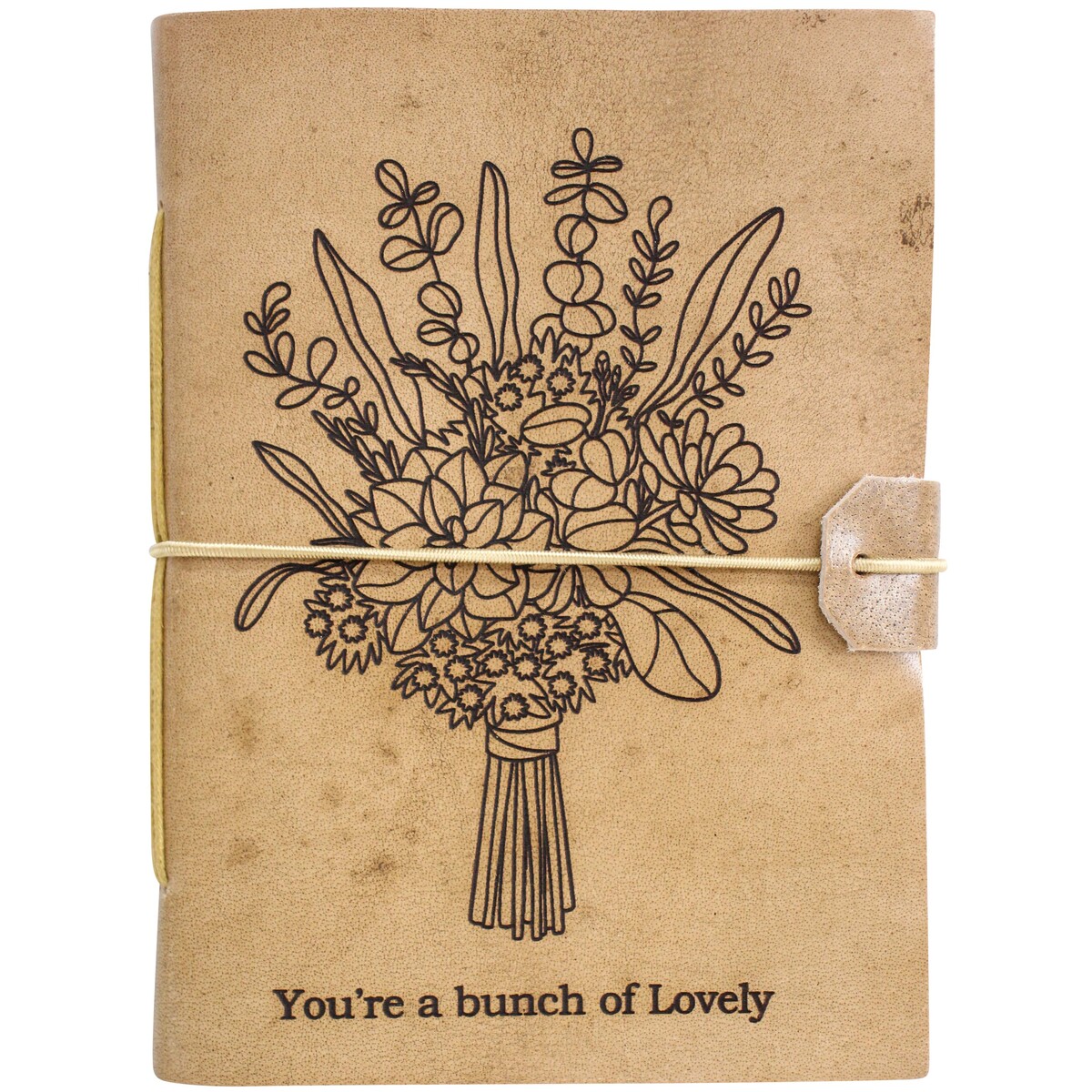 Indulge in the rustic charm and artisanal appeal of the Leather N/Book Lovely Bunch, a stationery piece that can effortlessly elevate any home or office space. This exquisite notebook, measuring 18x13 cm, is thoughtfully crafted from genuine leather and fine paper, offering a tactile experience unlike any other. The natural leather cover is adorned with a delicately etched floral motif accompanied by an endearing message, "You're a bunch of lovely," which resonates with warmth and individuality.