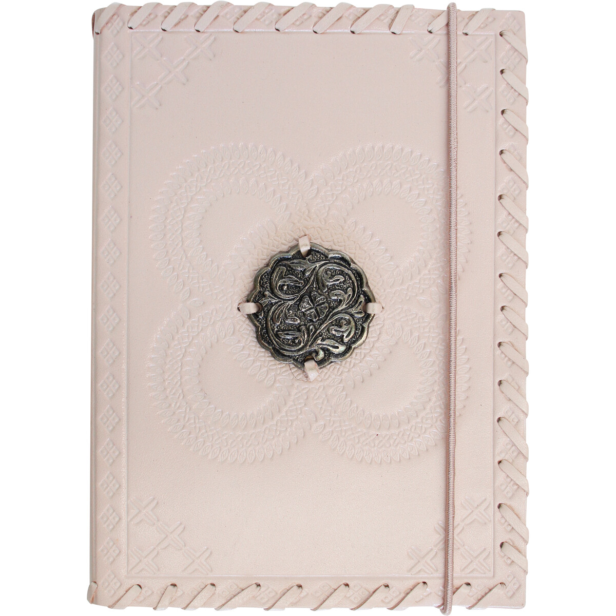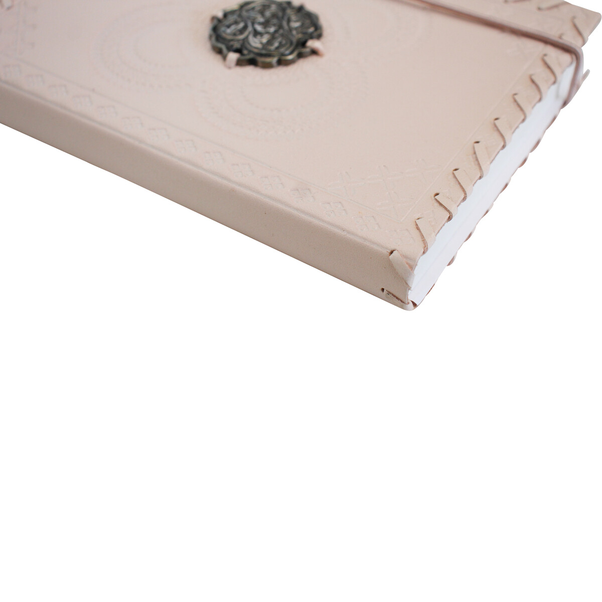 Discover the charm and elegance of the Leather N/Book Pink Medal, a beautiful addition to any home or office setting. Handcrafted with care, this distinctly unique journal marries function with style, perfect for capturing thoughts, dreams, or daily notes. Measuring a convenient 18x13cm, it's ideal for tucking into a purse or sitting proudly on a desk. The cover, a lush natural leather in a soft pink hue, is embossed with intricate patterns, culminating in a striking metallic medallion that exudes an old-world aesthetic.