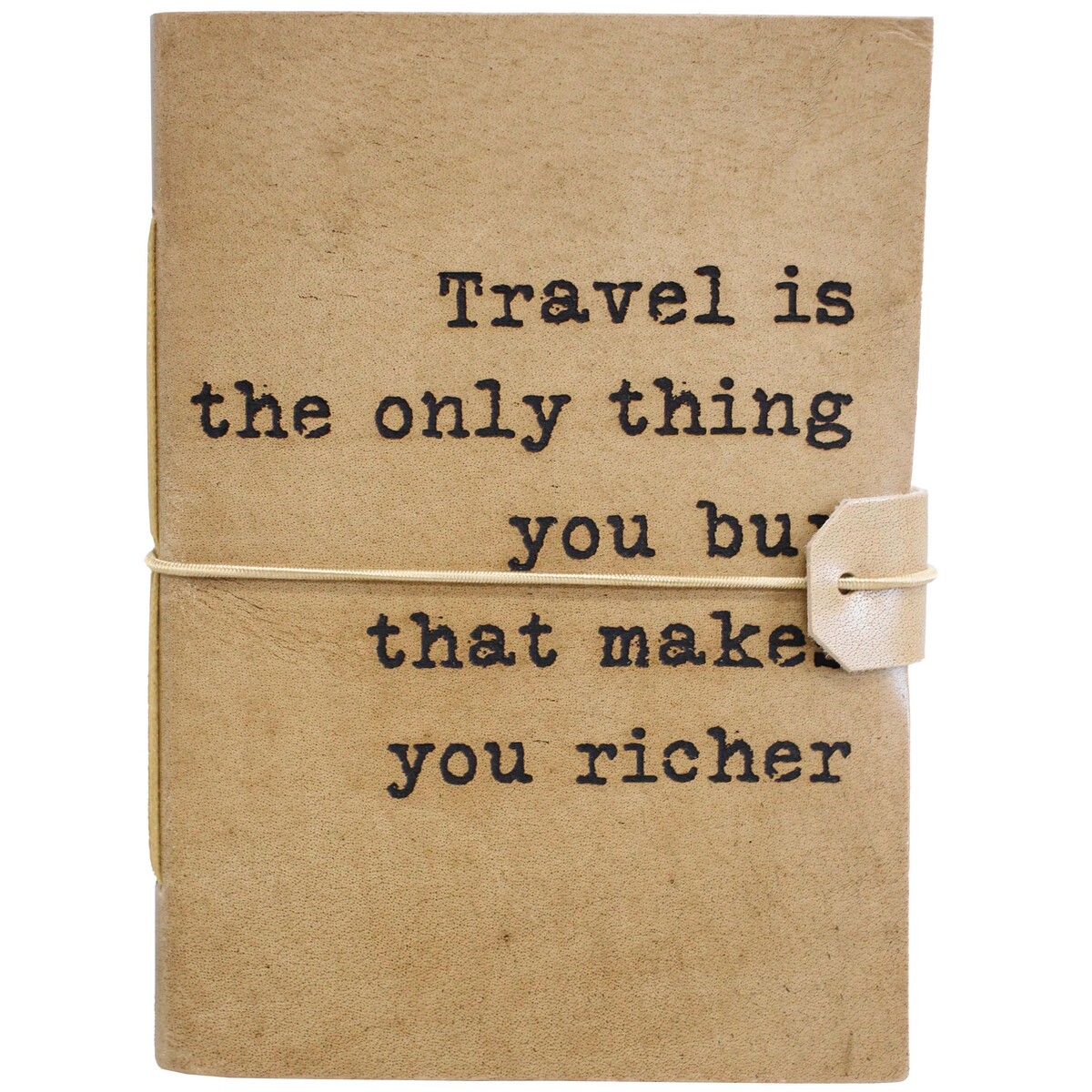 The cover, adorned with the uplifting phrase "Travel is the only thing you buy that makes you richer," serves not just as a conversation starter but also as a constant reminder of the boundless joy and enlightenment that comes with exploring the world. Inside, high-quality paper awaits your personal musings, plans, and dreams, invigorating the traditional act of journaling.