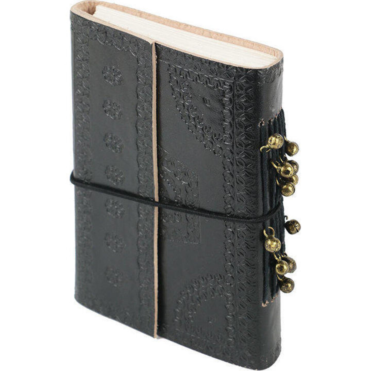 There are some of us who like details - be it noting down our own musing or simply ensuring that we forget nothing what we plan to do and thus like making our small little notes. Be it a phone number, an address, or a name - there is always something some of us like to pen down. Writing into a smart and vintage appeal notebook is the best way to accessorize your writing need. This folding leather cover notebook can be tied closed which keeps its pages neat and in place. The leather cover in black is supple ad folds with ease. The pattern on the top is a self - embossed kind. The pages held within are adequate and would be just great for keeping a journal style diary or for note writing. The bells attached to the edges adds a touch of Gypsy charm to its very eclectic looks. Made by hand, this well - crafted notebook showcases a perfect binding, a touch of brass dazzle and the perfect blend of utility and functionality with pretty good looks. The notebook is 13 cm in length and 9 mc in width.