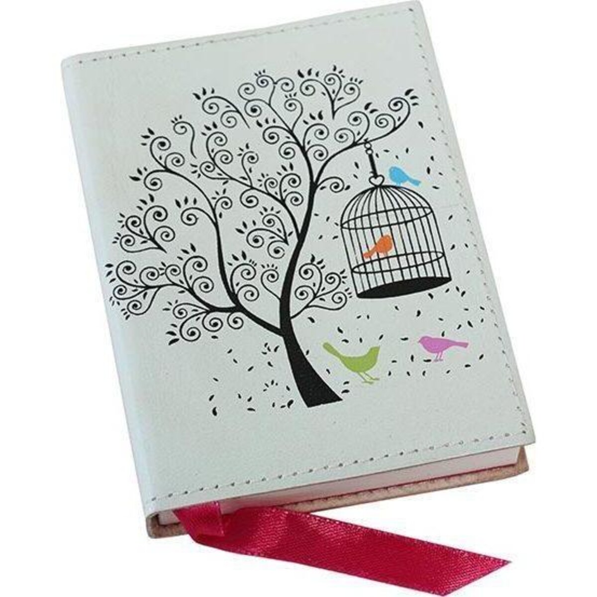 Add that edge of sophistication to the way your take down and carry your little book of important notes, Own this leather bound notebook in crisp smart little avatar that is barely 13 cm in height and 9 cm in width making it so very easy to grasp and open. This could be that little notebook where you take down all important phone numbers or addresses that you would hate to forget. Keep it in your purse and whip it out with great style when you feel like writing down some detail that interests you. Old world and certainly not the kind that is seen in this world of digitized writing, this charming little companion can fit into small bags and be available to you each time the urge to write down something arises. Its leather cover is smooth and well stitched and the binding is tough yet the opening of the pages is not stiff. The pink ribbon marks the page making it easy to open the relevant one easily. The white colour of the leather and the tree with the birds in different hues makes it so very dainty and attractive that anyone who cares for great handcrafted notebooks wild love to own this.