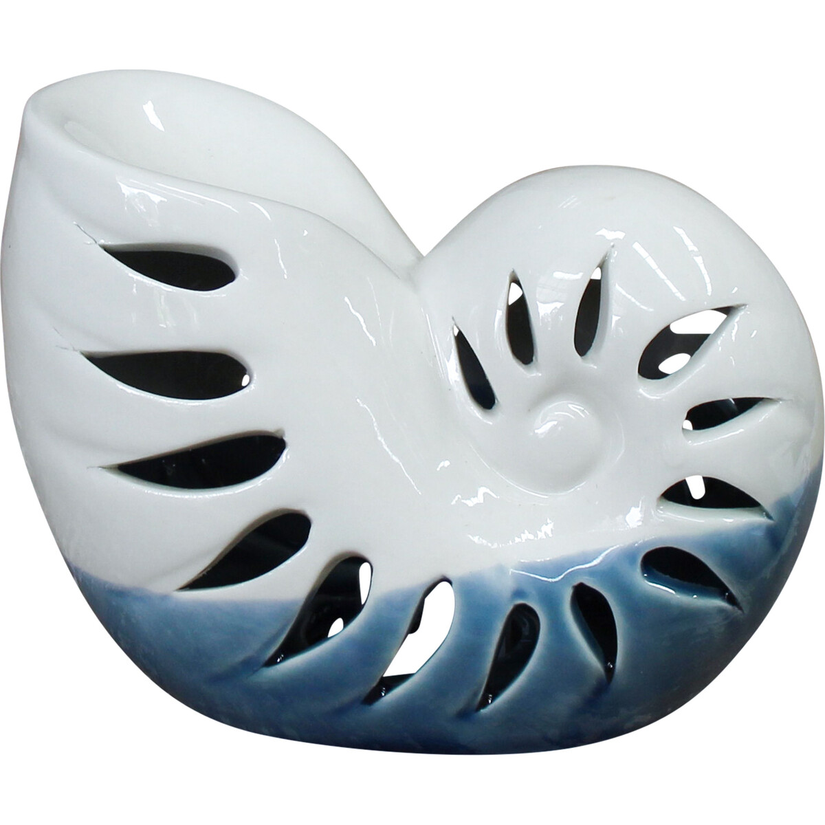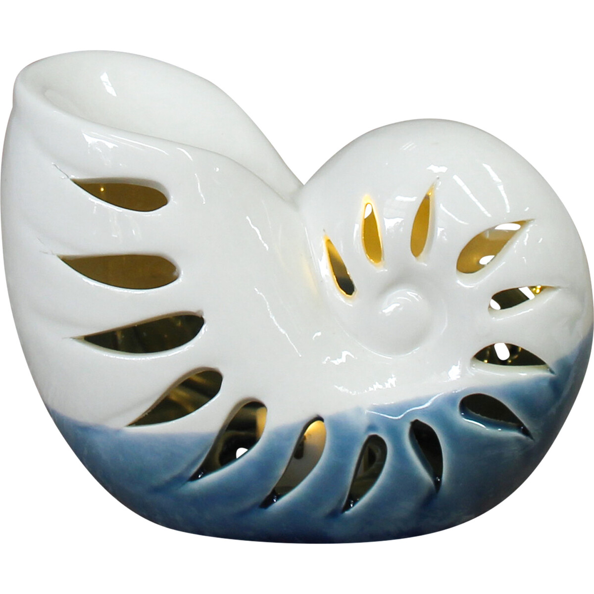 It will sit on the coffee table or the console with ample ease. It has been designed so that it sits well balanced on flat table tops. The LED bulb inside lights up to revel kits deign details so well. This is a great means to add that spot of illumination and help you saces liven up with marine appeal like never before. Made form hand crafted ceramic, this cinch is all of 12 cm in height and 9 cm in width and thus makes a quiet and stunning kind of statement with its presence. The dual shaded conch is all blue on the base and rises to be pristine white on the top. Comes with the LED bulb that helps light up when the evening demands some kind of ambient lighting. Will look beautiful in the mornings too when it is not illuminated form inside because the ceramic made structure is so very appealing in its looks.