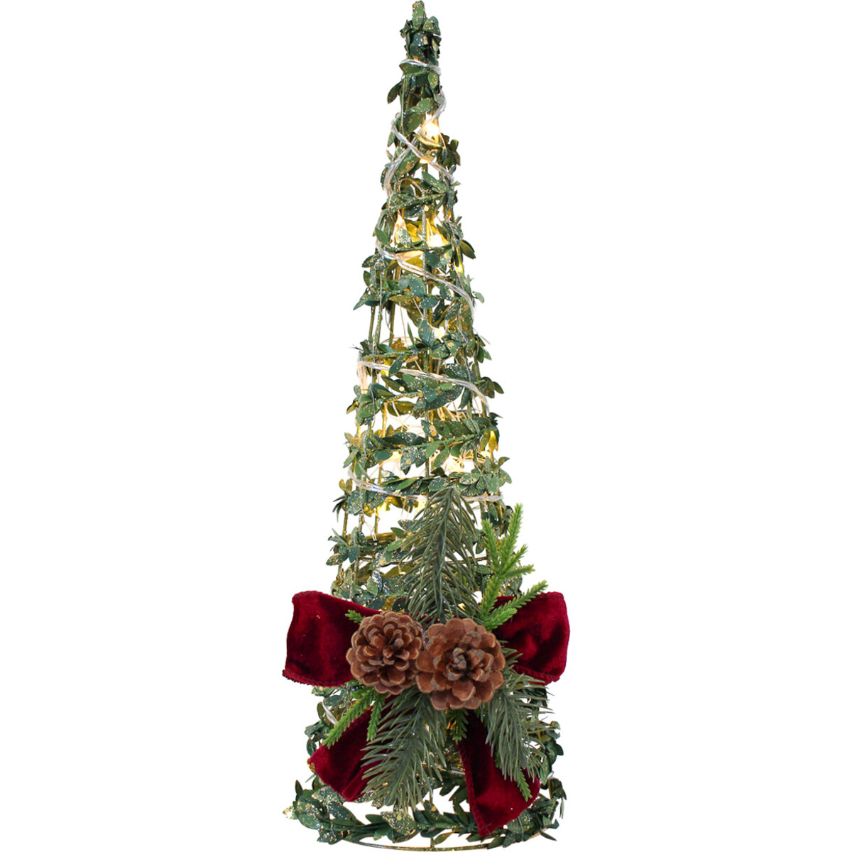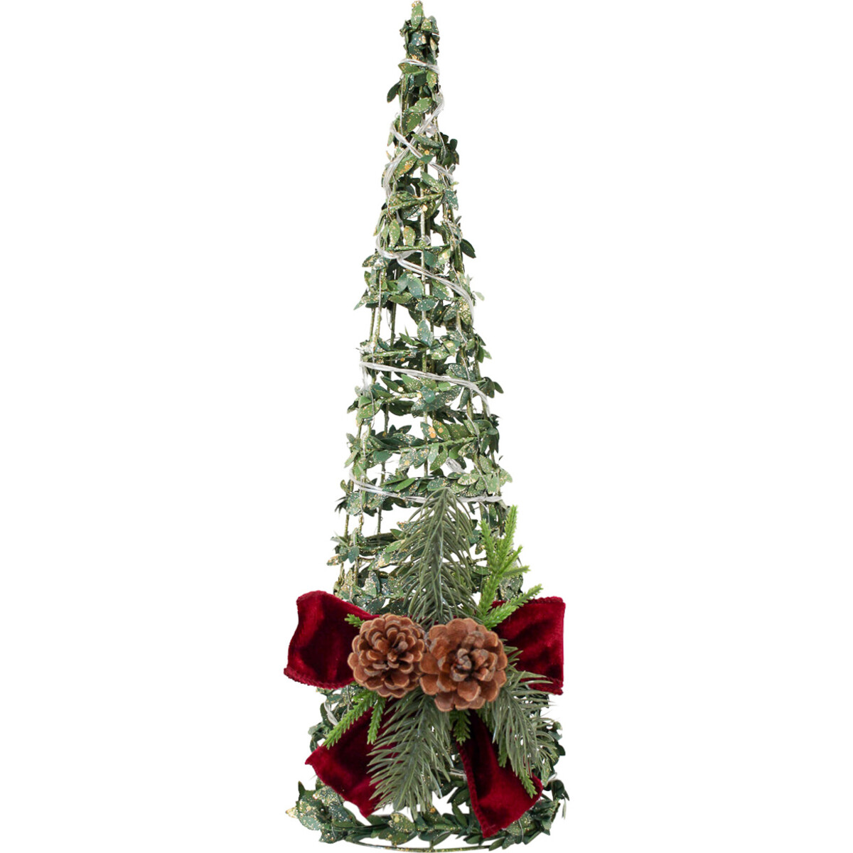 Pre-decorated in such a classically beautiful manner, the Xmas Tree Cone Buxus Small is sure to arouse ornamental interests from your customers. This Christmas decorating ornament is a product suitable for adding festive elegance to every Christmas decoration that your customers may intend to engage in. It is pre-decorated using velvet fabric French tie, pine cones, and illuminated using Christmas stringed lights which is made up of clear wire casing on which are 10 LEDs evenly spaced from one another for that soothing decorative glow. This small Buxus tree ornament stands at just 40 centimetres in height and has a larger variant.