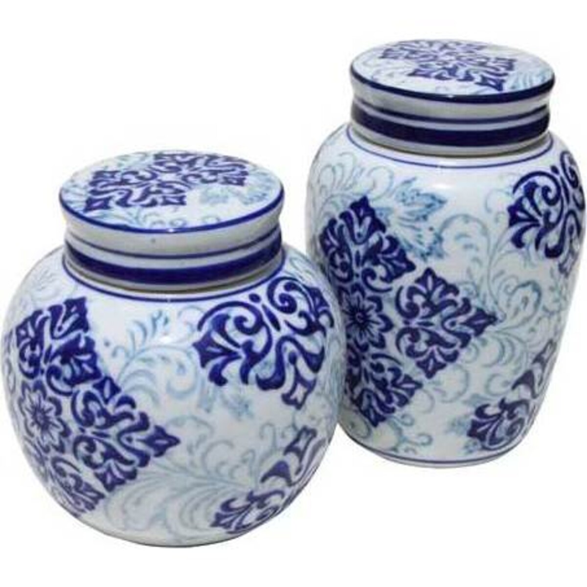 Two distinct, but complementary, shades of blue make a striking contrast with crisp, white ceramic in this Lidded Jar Fleur Hoja Round from LaVida. Medallions rendered in bold, cobalt blue are paired with a background of filigree patterns in soft, porcelain blue for a traditional colour motif.