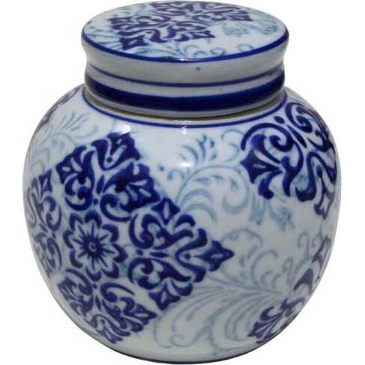 The timeless combination of blue and white is revived in the Lidded Jar Fleur Hoja Round from LaVida. A striking medallion design in cobalt blue, coupled with the softness of light blue filigree swirls, adds classic style to most any space. The jar's lid is finished with bold stripes of deep, cobalt blue for added contrast. Standing at 10 centimetres tall, this jar is the smaller of two offered by LaVida. Utilize the jar alone for a hint of traditional styling or pair with its taller counterpart for an even stronger statement.
