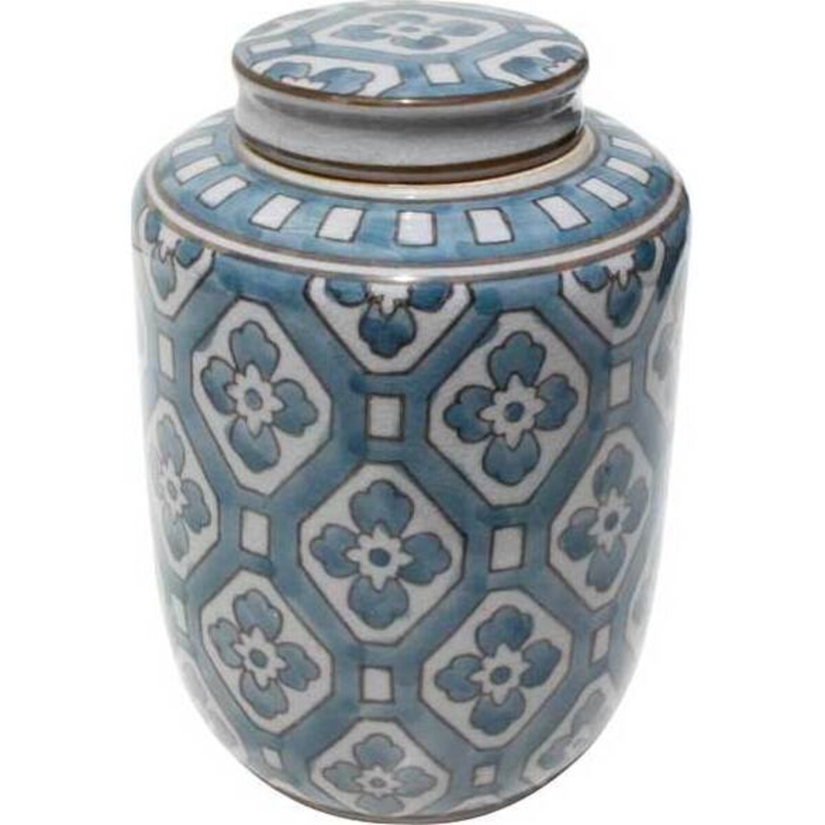 LaVida's Lidded Jar Flower Medallion Large adds just the right touch classic style to any room. The jar, in painted tones of crisp blue and white features a hexagonal, medallion pattern, accent with flowers. The jar can easily stand alone or be paired with LaVida's smaller version for a style statement.