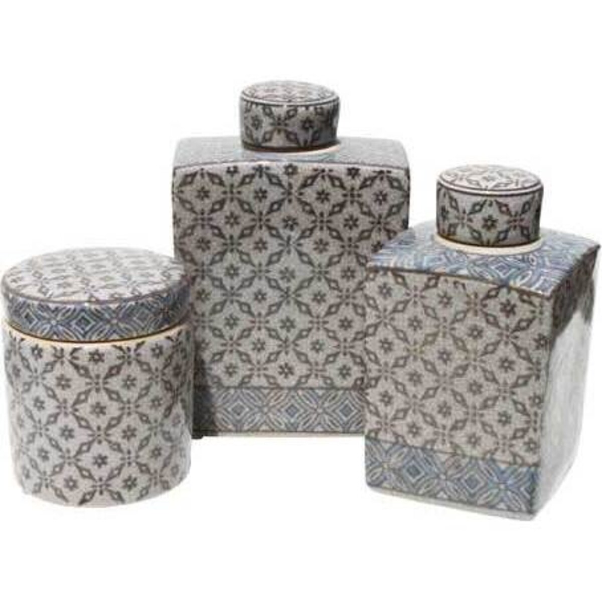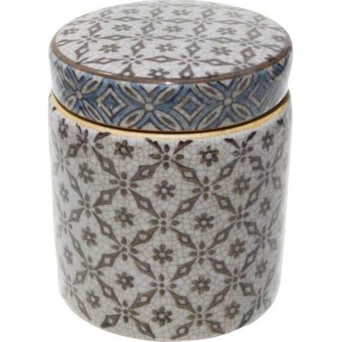 The smallest in a three - piece collection, this Lidded Jar Cross Diamond Small from LaVida offers a traditional touch to any room. A soft gray and white diamond pattern adorns the jar from top to bottom, while the lid features a complementary diamond pattern in delicate blue, white and grey.