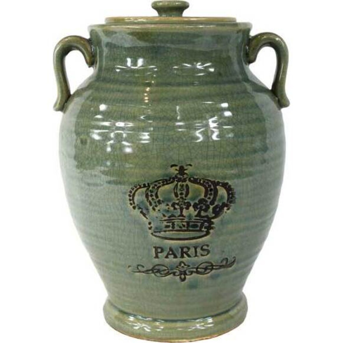 This green jar is embellished with a black crown at the center with "Paris" stamped underneath. For a final flourish, an elaborate black line sits underneath. A handle on either side makes this item easy to move and transport while a lid at the top keeps its contents safe. Considering its size, this jar would be perfect to use in a variety of ways including storing sugar or flour, using it as a coin jar, or even taking the lid off and using it as a vase. You'll simply love its beauty and versatility.