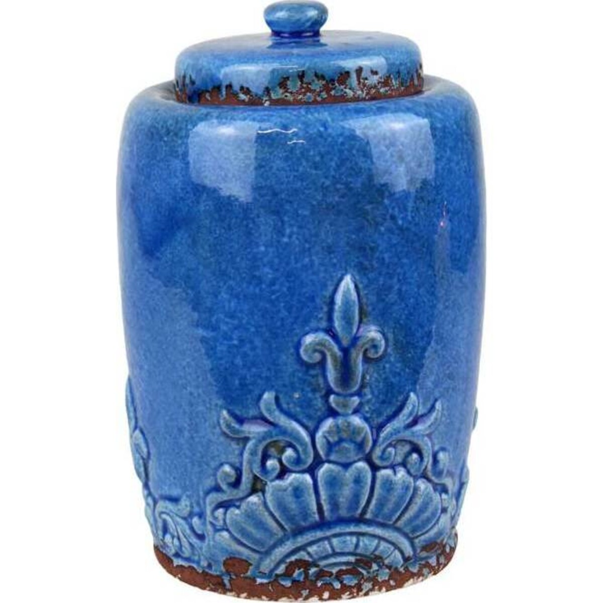 Each urn has an exquisite cobalt blue colouring with brown detailing along the edges of the lid and the base. The best feature of the urns are the elaborate detailed designs around the body. The urns can be displayed as is or you can fill them up and hide items inside. They're small enough to store several different items, such as candy, make - up, jewellery, and even dry foods, while still being large and bright enough to be attention - grabbing. These are sure to add a beautiful touch of colour wherever you put them.