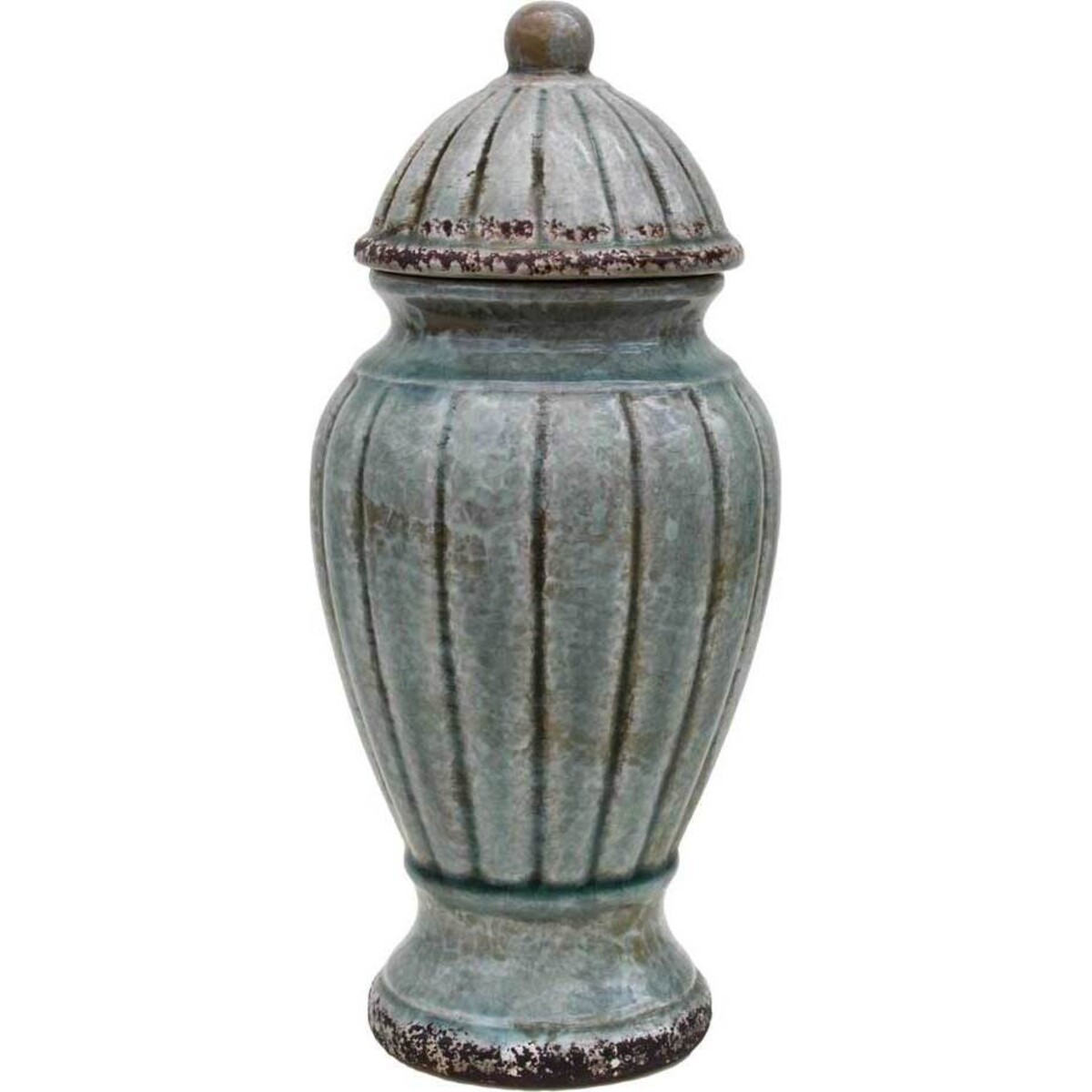 This Lidded Urn features a blue gray colouring from top-to-bottom with vertical line detailing on the body and a ball as the finishing touch at the top of the lid. The piece is detailed with brown to give it an aged look, as if it's been sitting on the shelf of an antique shop for years. While this piece is lovely to display as is, it's also great to use to hide items, such as your favourite stash of candy, that you don't want anyone else to find. You'll love incorporating this piece into your home.