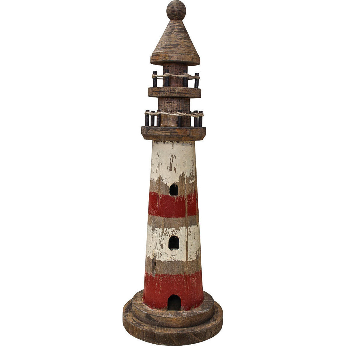 Crafted from wood-its peeling paint in auburn rusty colours and white reminding you of real life light houses that having seen the salt drenched winds day after day bear the brunt on their paintwork- and yet they continue to be the beacon of hope for many travellers out at high seas. The beautifully crafted piece is about 40 cm tall and is bound to bring into the décor the same wonder and excitement that is connected with all things marine ad connected to the sea and its numerous adventures.
