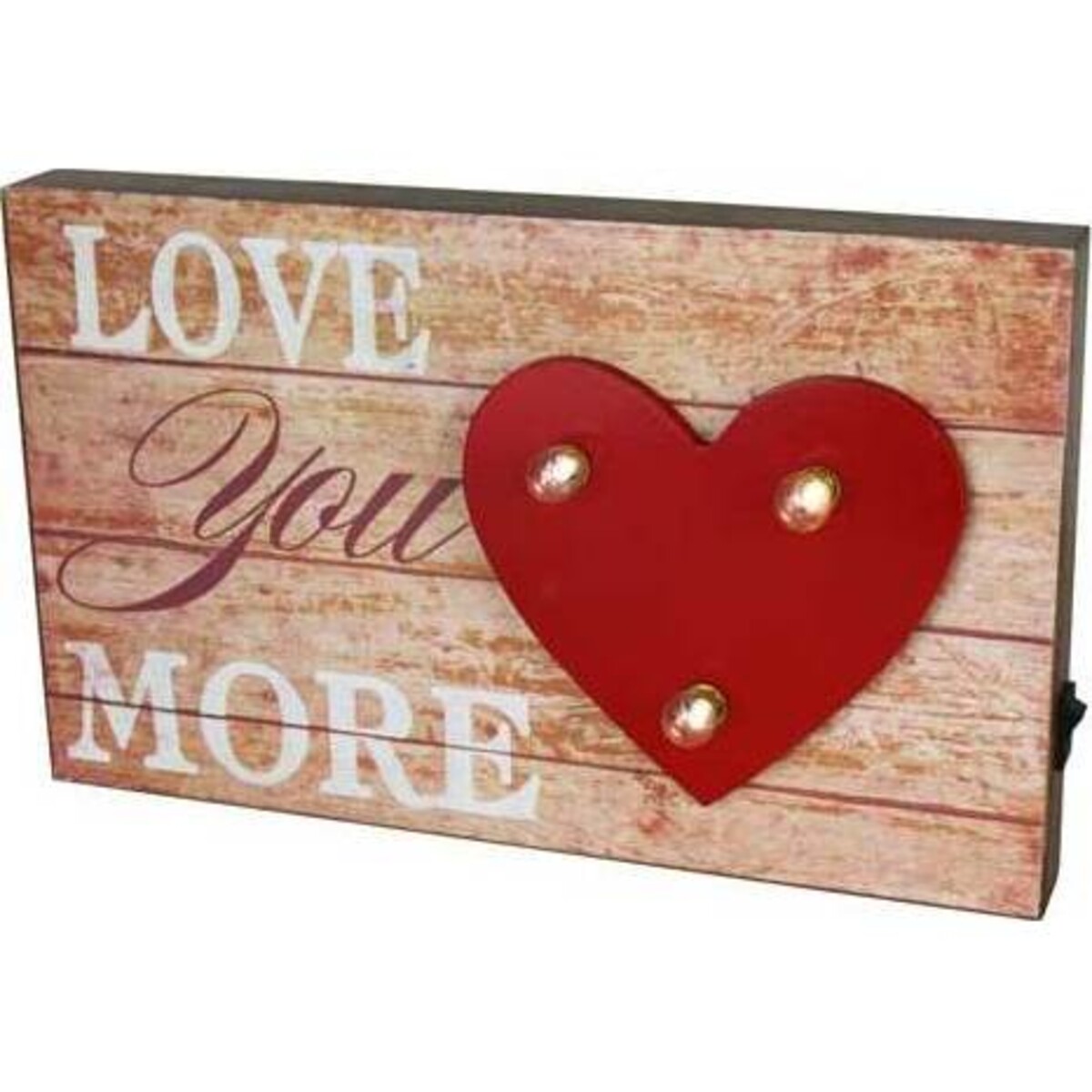 Sure to light up one's heart with its warm words and of course its looks, this lit up sign that says - Love You More - is indeed the best way to say what the heart fears it can no longer hold back. About 23 cm in length and 18 cm in width this sign board declares in a loud hush the words that can make everything seem bright and wonderful. The wood effect backing looks perfect for the letters painted in white and vintage red. The red heart is where three tiny little lights begin glowing when a button is pressed. The sign comes with the bulb fitting. The bulbs look like three tiny golden knobs and little does one realize that they can light up when the needed. It can be great gift for the those who wish to wear their heart on their sleeve and love declaring their love to the world and more so to the person who is so very important for them.