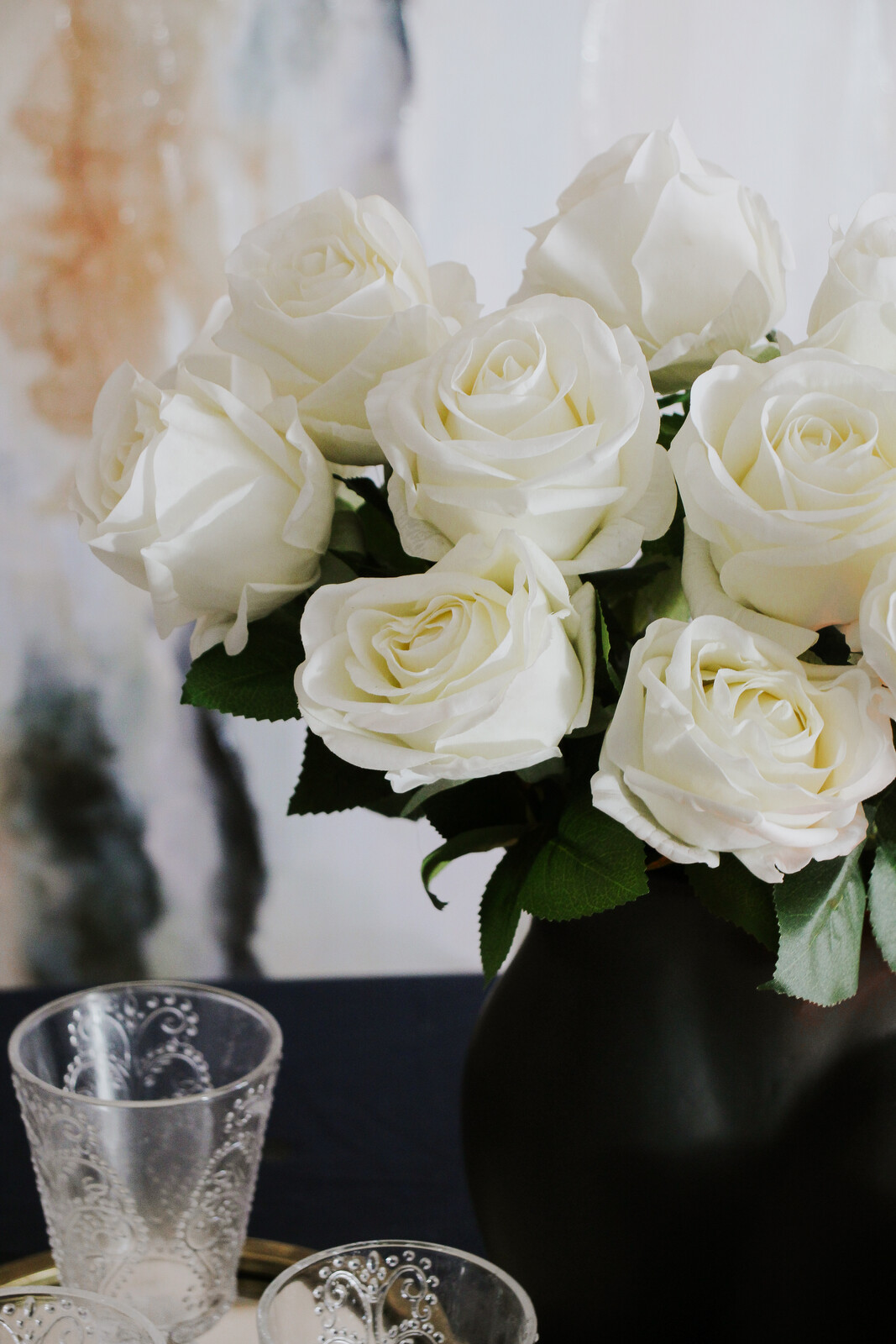 Twelve centimetres across and just over seventy centimetres tall, it’s a fair statement piece for a vase or to mix into an arrangement. We’ve seen retailers use the white rose in everything from soft farmhouse style displays to contemporary minimal looks. Classic, but not boring – it’s one of those bits that seems to fit anywhere you put it.