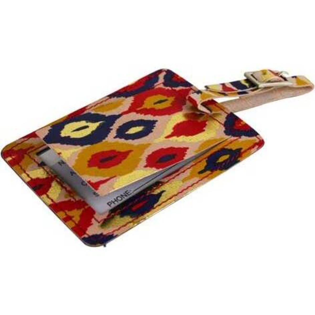 Luggage Tag Colour Diamond measures 8x11 cm + strap and is made using leather, plastic and paper for indicating ownership information. It features beautiful patterns of resplendent form with red, yellow and blue being the most visible colours. This item has a strap attached onto it to facilitate the tagging process effectively. Bags which get tagged using it stands out clearly due to its prominence which helps in monitoring and locating them with ease at an airport and other places. Luggage Tag Colour Diamond is a unique product of creative excellence that a person would feel confident bearing on luggage in public.