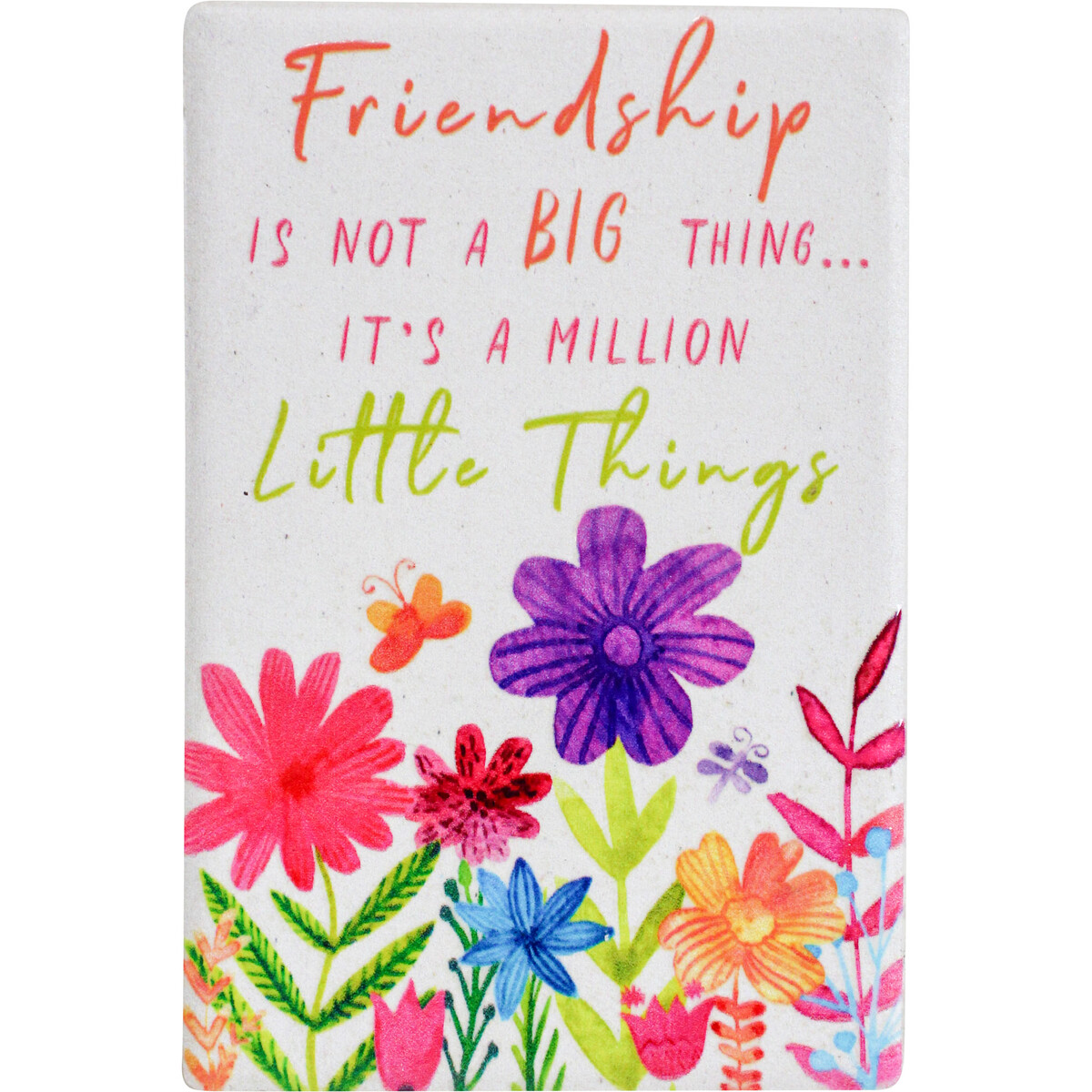Adorned with colourful flowers, this magnet showcases the beauty of bloom, mirroring the blossoming nature of true friendships. Perfect for any fridge or magnetic surface, it becomes a daily reminder of the profound importance of the million little things that make our friendships unique. Whether given as a thoughtful gift to a friend or kept as a personal reminder of the special bonds shared, the Magnet Friendship is more than just a decoration – it's a celebration of the countless small moments that make friendships extraordinary. Adding this colourful and powerful piece of art to any home or workspace will spark meaningful conversations and help create true connections which can bring added beauty, joy, depth, connection and purpose into any living space.