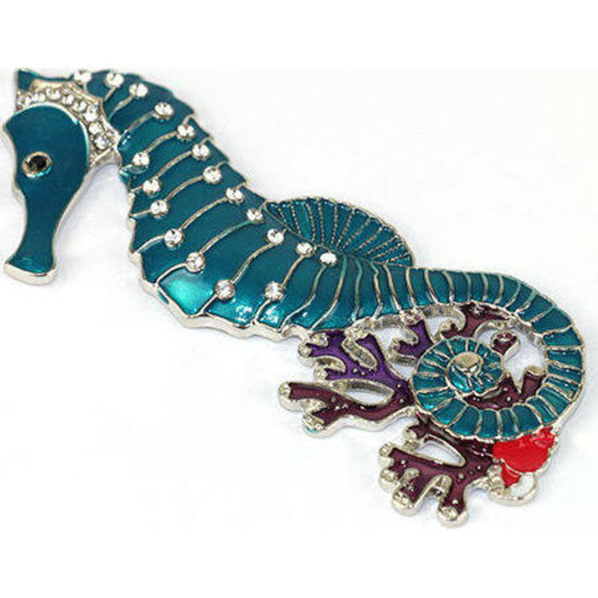 The crafting of this gorgeously shaped seahorse is stunning not just in the usage of colour and shape but the very manner in which the replication goes into details. The curved body, so very graceful, the head that defines the creature and the lavishly detailed fins, make it a beautiful artefact quality accent. Place it on locker doors, your own office almirah, the desk, or the usual fridge door-wherever it is placed, the seahorse will bring in the beauty of nature through its exquisite presence. The enamel shines brilliant, the tiny diamante glitter in places and the metal body holds it all together beautifully. The magnet at the back is strong enough to take the weight of the piece and will hold on string to metal surface easily. the ribbed body, the glittering dark eye and the supine shape -all lend this little accent for small spaces a wonderful finish. Add it to bring in a coastal touch.