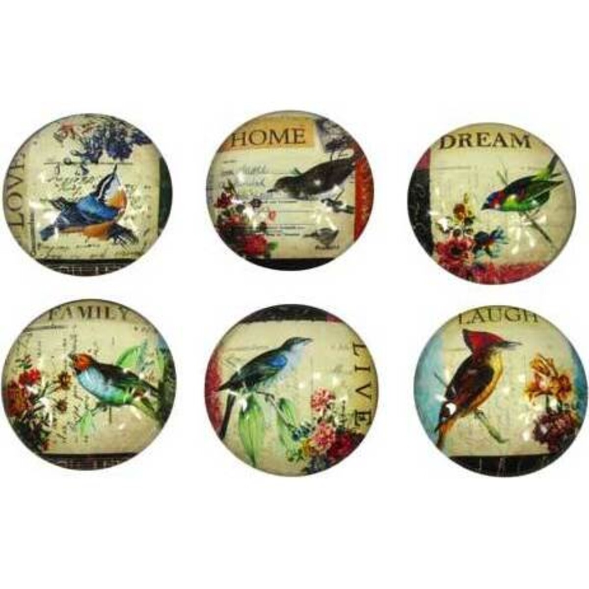 • Each individual round magnet has an aged, parchment-like background with faded information about the bird depicted on it