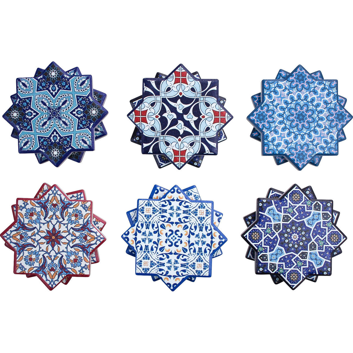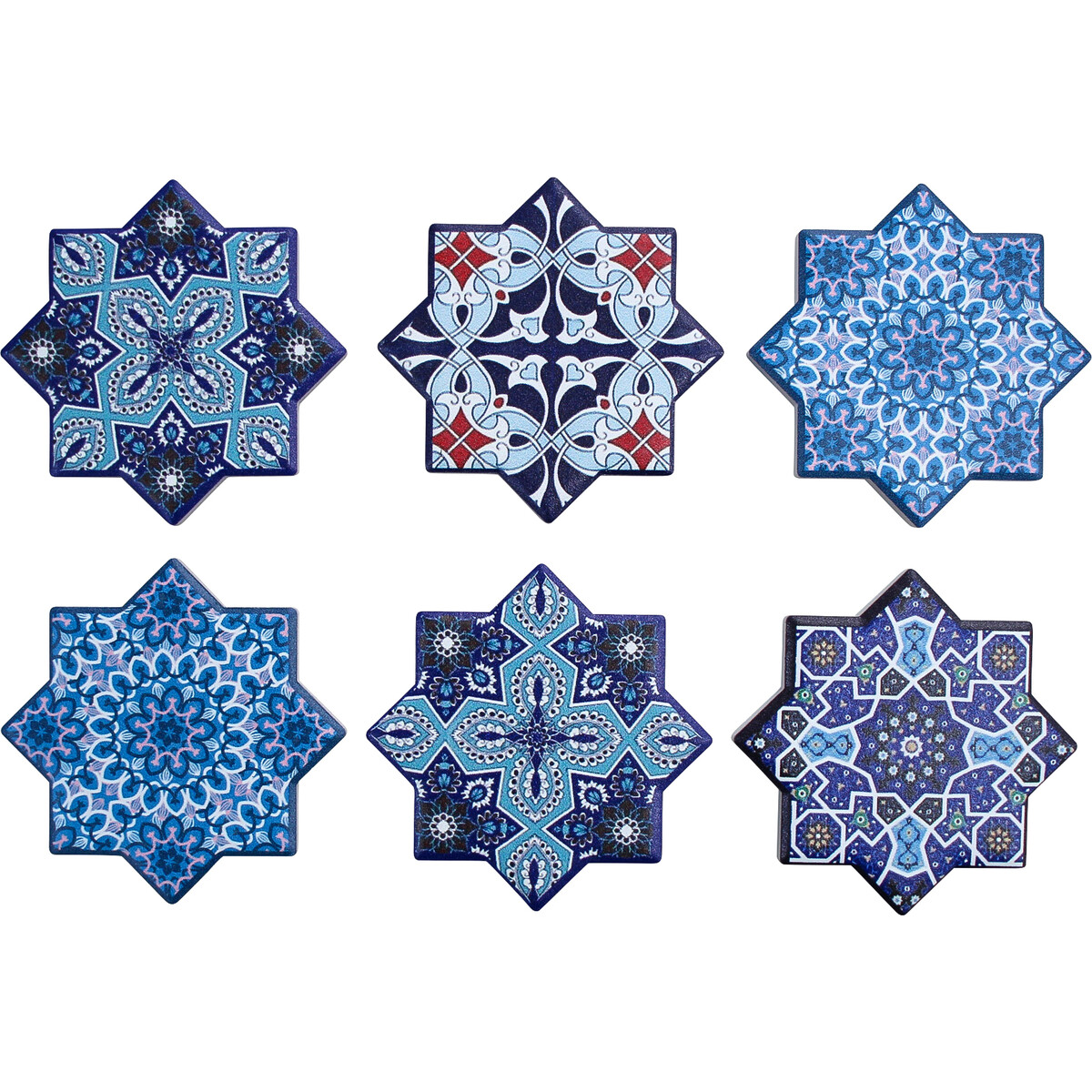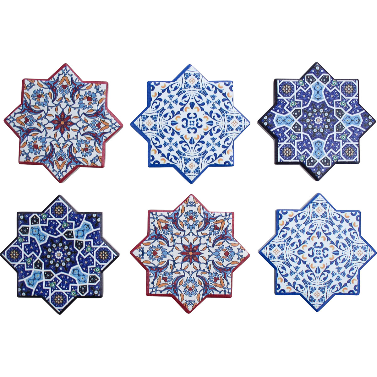 Give your spaces the delightful touch of pattern and colour with this set of Moroccan tile magnets that will prove to be an adornment of a small variety yet will be extremely impactful in their little presence, made from ceramic on top and cork in its base. The tiny little prices can be placed on metal doors, frames and all those tiny nooks that could do with some colour and pattern. The set ahs twelve with six patterns with two of each kind-you could arrange them as you would any set if colourful tiles or scatter them in various places. Adorning metal doors and plain window frames just got a lot easier. They are about 6 cm in width and also could double up like coasters on your table. brigs in colourful vibrancy with colours and patterns. Superb energy such designs and colours bring with them.