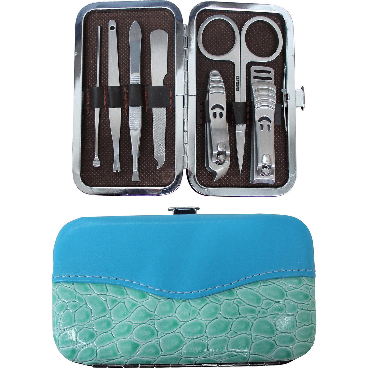 In shape of a compact little bright blue purse that has a push-lock closure, half of the top outer portion is in a plain aqua blue hue with a curved design finished with neat seams and the other half has a lovely greenish-blue crocodile skin pattern for an attractive look. The interior of the kit is dark brown in contrast, with the different implements properly organized in individual slots stitched into the pouch for quick access whenever required. This set will make a wonderful Mother's Day, Valentine's Day or Birthday gift item that is sure to make a lady smile!