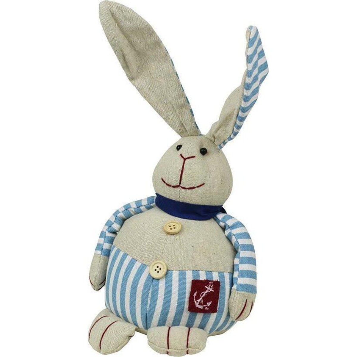 This cotton made bunny comes with all the trappings of being a perfcet cuddly bunny your child wanted. And when given the look of a sailor you will find a rather queer sailor emerging in this character wearing bloomers in white and blue stripes, a deep blue collar and buttons down his front, here is the most magical of marine rabbits whose love for the sea and exploring the world is unquestionable. The rabbit is cheerful looking, with long ears that have a striped blue and white design, the same as on his bloomers. The construction is in cotton fabric and the filling used is as lightweight yet sturdy and not the kind that will flatten out easily. The detailing of the facial features has been created from red thread that has also been used on the hands and feet. The bunny wears a patch on his bloomers that has the typical symbol of a mariner - an anchor. Gift this Marine bunny to someone whose love for stuffed sift toys is as much as his love for things marine and nautical.