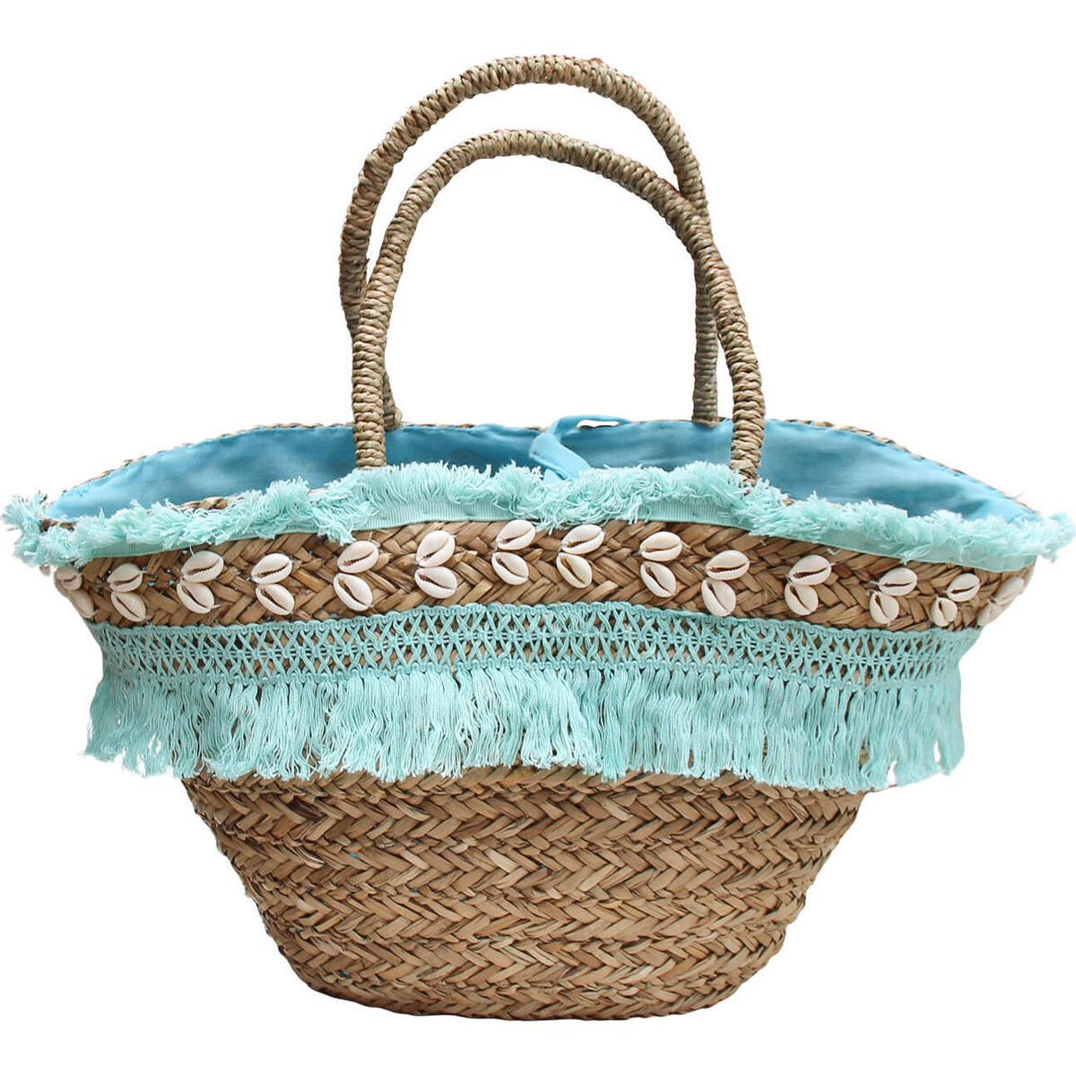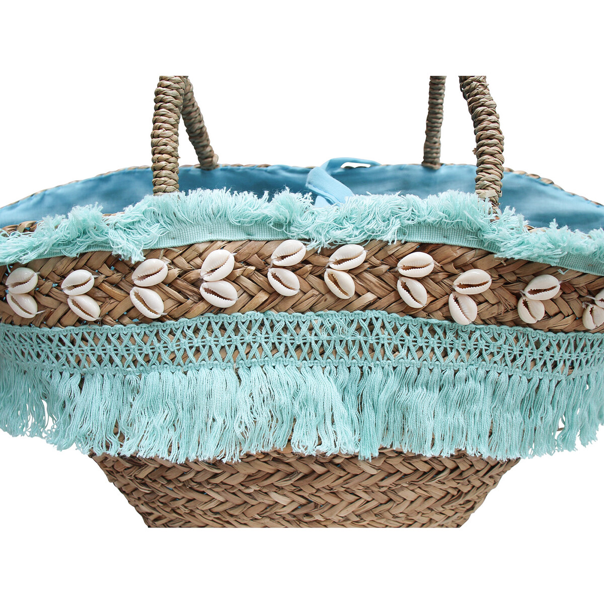 The weave of the basket bag is as ancient, perhaps as old as the very craft of weaving. The superb styling of the boat bag makes it very wide at the top and narrowing down to a small little base. The broad band of blue fringe with an underlay of blue cotton lace and the inner cotton lining of the bag-come together in a harmonious kind of look, truly refreshing and summery. The delightful row of shells -white and pleasing in contrast makes it all the more ready for summer in its look. The bag sits well on the shoulder, allows an ample space for all your last-minute deals that are hard to let go and will enable your entire day to pass with ease allowing you the ease of holding a super comfortable bag that is lightweight yet tremendously sturdy. Bring back the joy of shopping by easing the day with the right choice in a fine market bag. The bag is all of 50 cm in length and in height all of 40 cm. Its wide on top and narrow at the base. Comes with a finely stitched structure and inner lining.