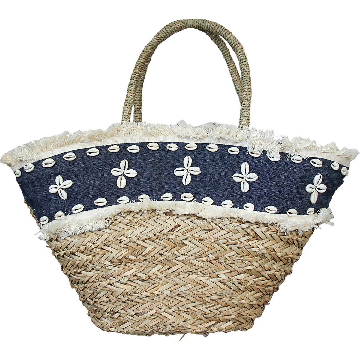 Glamourize the manner in which you shop with this large and roomy bag made from straw created from seagrass. Its soft, supple. lightweight and yet turdy enough for holding most of your day's needs. The cotton embellishment, the shells on the body and the soft made handles are all features that will instantly make you want to pick it up and swing it on your shoulders. The softly woven fibre stands out with its rustic kind of charm, the bag being narrow at its base and wide open on the top. The upper body has a stripe of fabric embellished with shells that adds more to its rather attractive looks. The blue and white combines wonderfully with the natural seagrass colour adding to its organic kind of looks. The bag is 50 cm in length and about 45 cm in height with wide rounded curved handles also made of seagrass that has been traded to feel smooth when held.