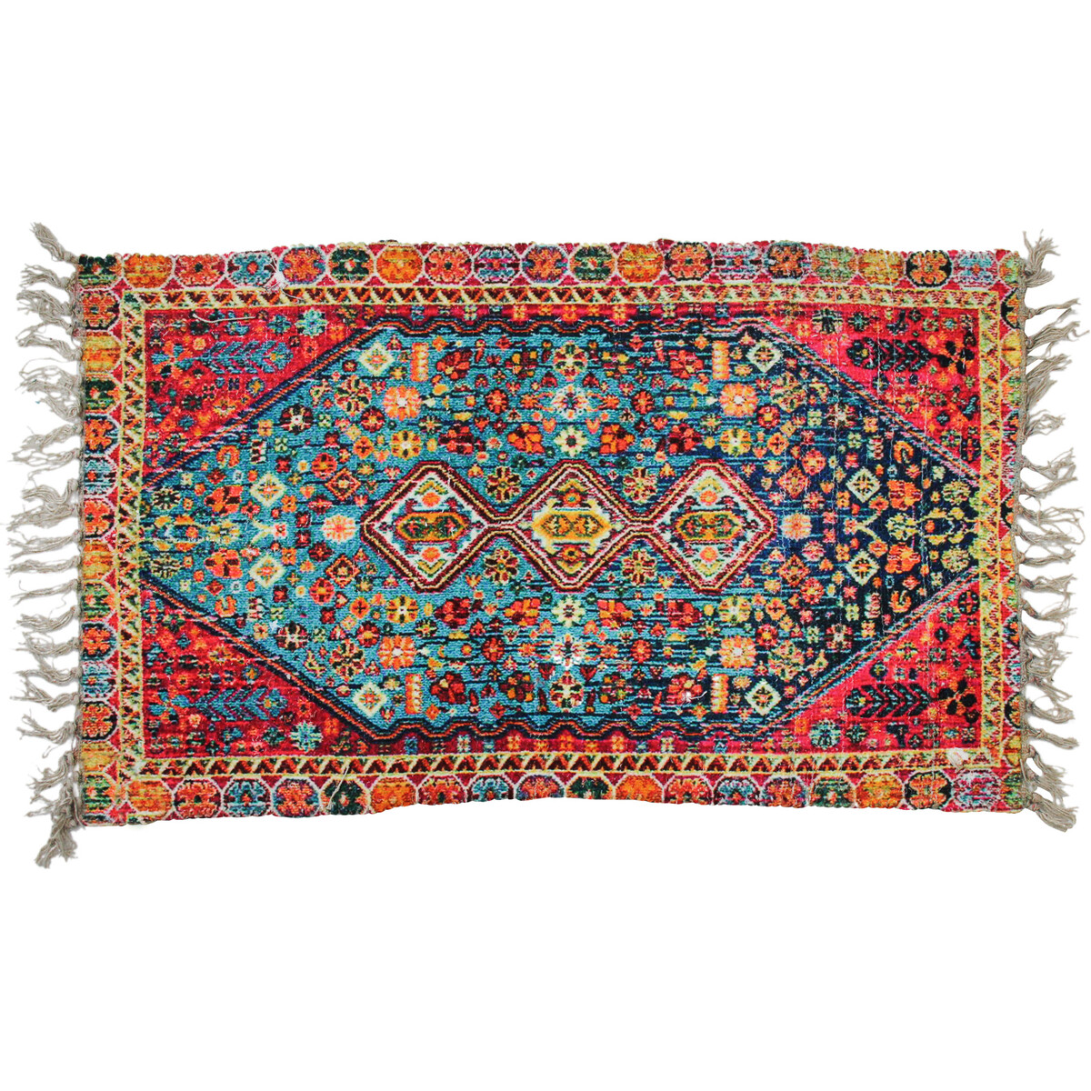 Give a small little style update to your spaces with the inclusion of this mat made from chenille, the flat weave of the material has been printed in the brilliant colours of the pattern replicating and age old traditional Persian style carpet. The material feels soft underfoot and the size of the mat at 90 cm length and 50 cm width suits most room sizes. The pattern replicates a richly hued Persian rug pattern. The fringed ends are in white as is the reverse of the rug which also shows its simple flat weave. The mat is shedding free and thereby suitable for homes with pets and kids. could be used like an area rug I the living room, the guest room or the entrance of your home to usher in a bright and welcoming warmth that fine quality carpeting brings with it.