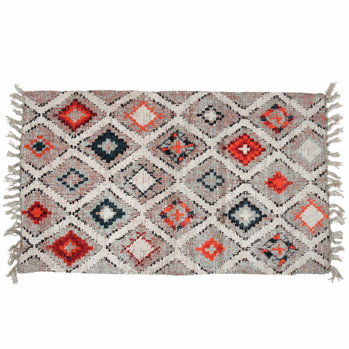 The size is most suited for a living room space or the front of your bed and the chenille construct adds a delightful softness underfoot with its presence. The bold pattern reminiscent of ikat weaves of the Incas has a colours like deep maroon to grey and rust and white coming together for a delightful contrast of shades and hues. The fringed white ends lend it a lovely fresh definition is easy to wash and lies flat on floors. The chenille has the distinctive soft sheen which makes it a delightful material for usage for everyday with out the usual upkeep with wool and other material. Is especially suited for homes with pets and kids, where keeping the carpeting clean does tend to be a task.