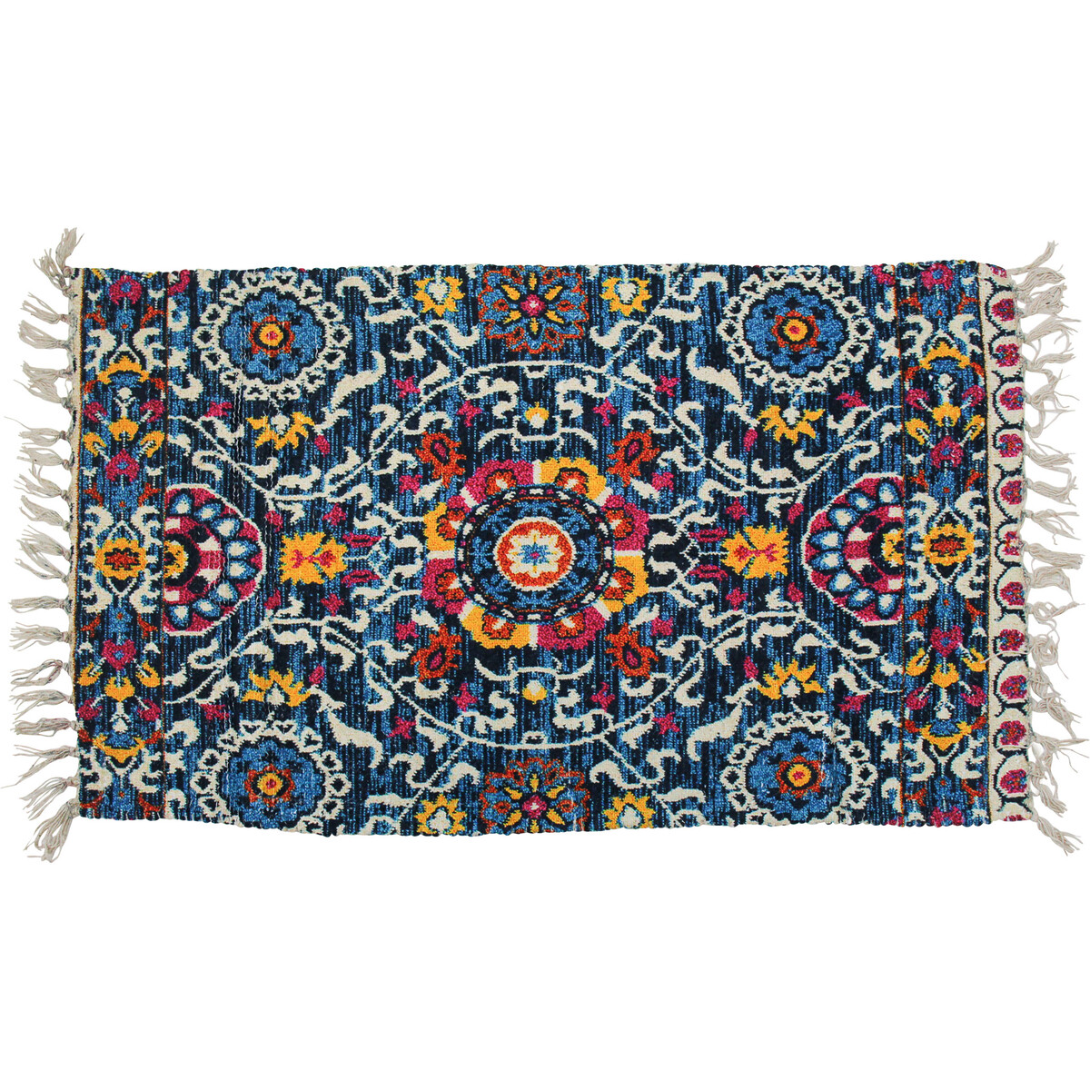 A printed chenille rug that adds to the feeling of super soft comfort underfoot. The material itself is lightweight and the rug is easy to clean as the material is washable and dries out easily. The print brings out the robust colour palette and the pattern with much accuracy. Will help complete the look in any room because rugs usually help tie in varying elements in the décor to make the space look more completely decorated. The rug is 80% polyester and 20% cotton making its touch and feel super soft and its polyester content is bound to make. the rug is all white on its reverse. The rug is 90 cm in length and 50 cm in width making it great for a small space or for placing it under the coffee table. The fringed ends make it all the more delightful.