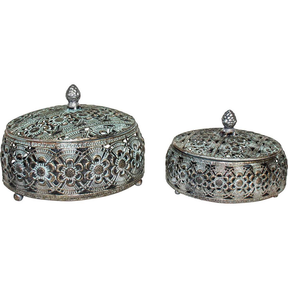 The Metal Bakir Box S/2 has an unquestionable aesthetic appeal which is made possible by its stunning ornamental inclination beautifully represented in its elaborately patterned body. Each of the two metal boxes contained in this set is made in a squat cylindrical shaped dimension that is wide with a domed lid. The small sized version measures 15.5 centimetres in length, 15.5 centimetres in width and stands at 10 centimetres in height. The large sized version is made in a dimension which measures 19 centimetres in length, 19 centimetres in width and 14 centimetres in height. Both have a classic silver appeal.