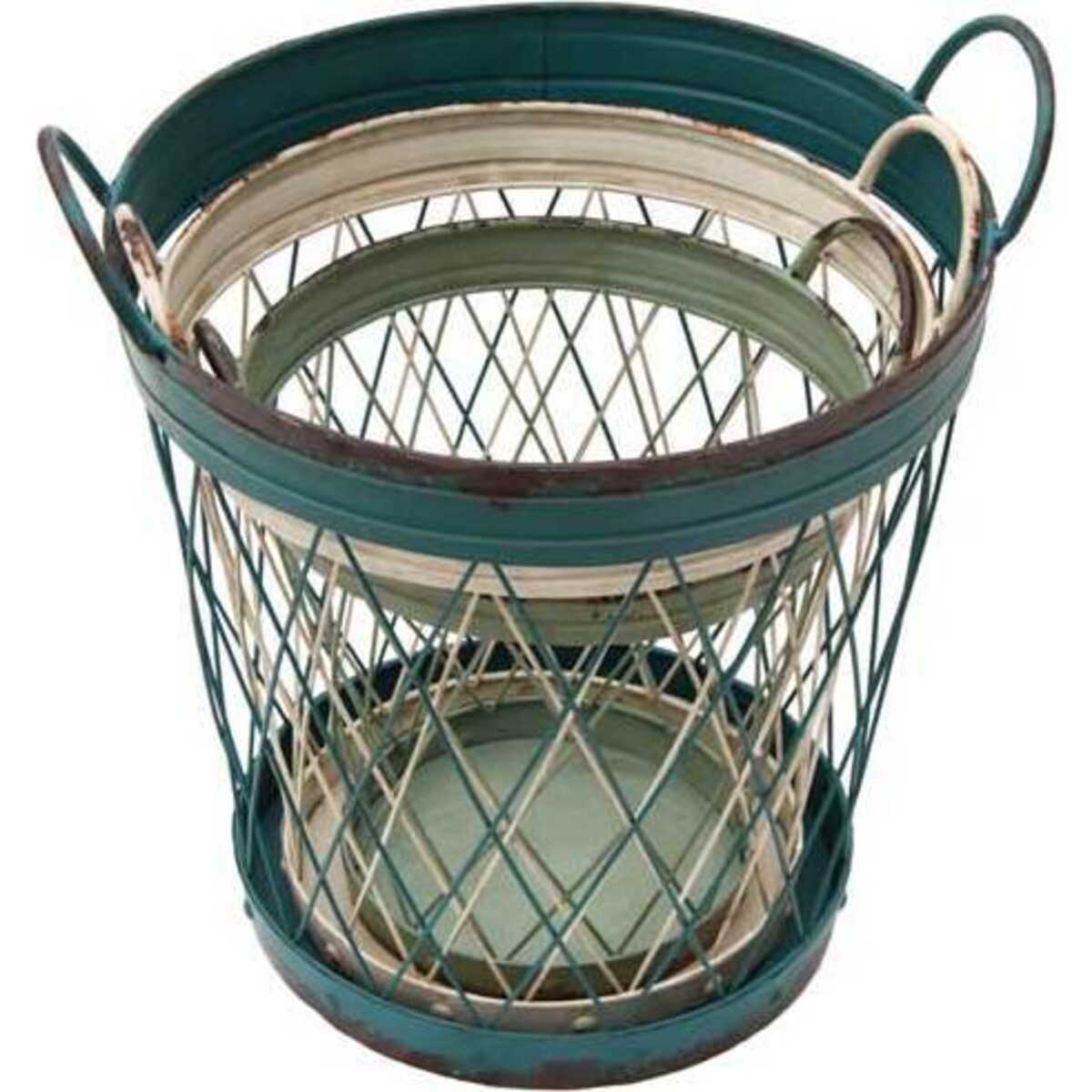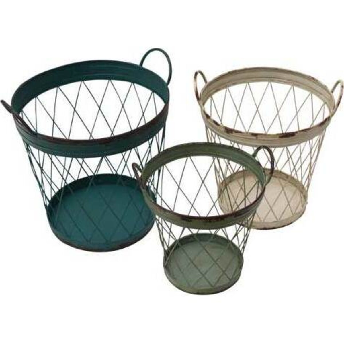 Metal Baskets Croix is a set of three baskets crafted out of metal in entirety. These include the large one measuring 45x40x46 cm, medium one measuring 39x35x41 cm and small one with dimensions of 34x30x35 cm. They comprise of flat base and strap of metal around the top, from which arise two handles placed directly opposite each other. These two parts are joined by meshwork of metal, which presents a beautiful artefact for use indoors. Metal Baskets Croix features a unique blend of colour for the three items and may be utilized for keeping items of totally different nature.