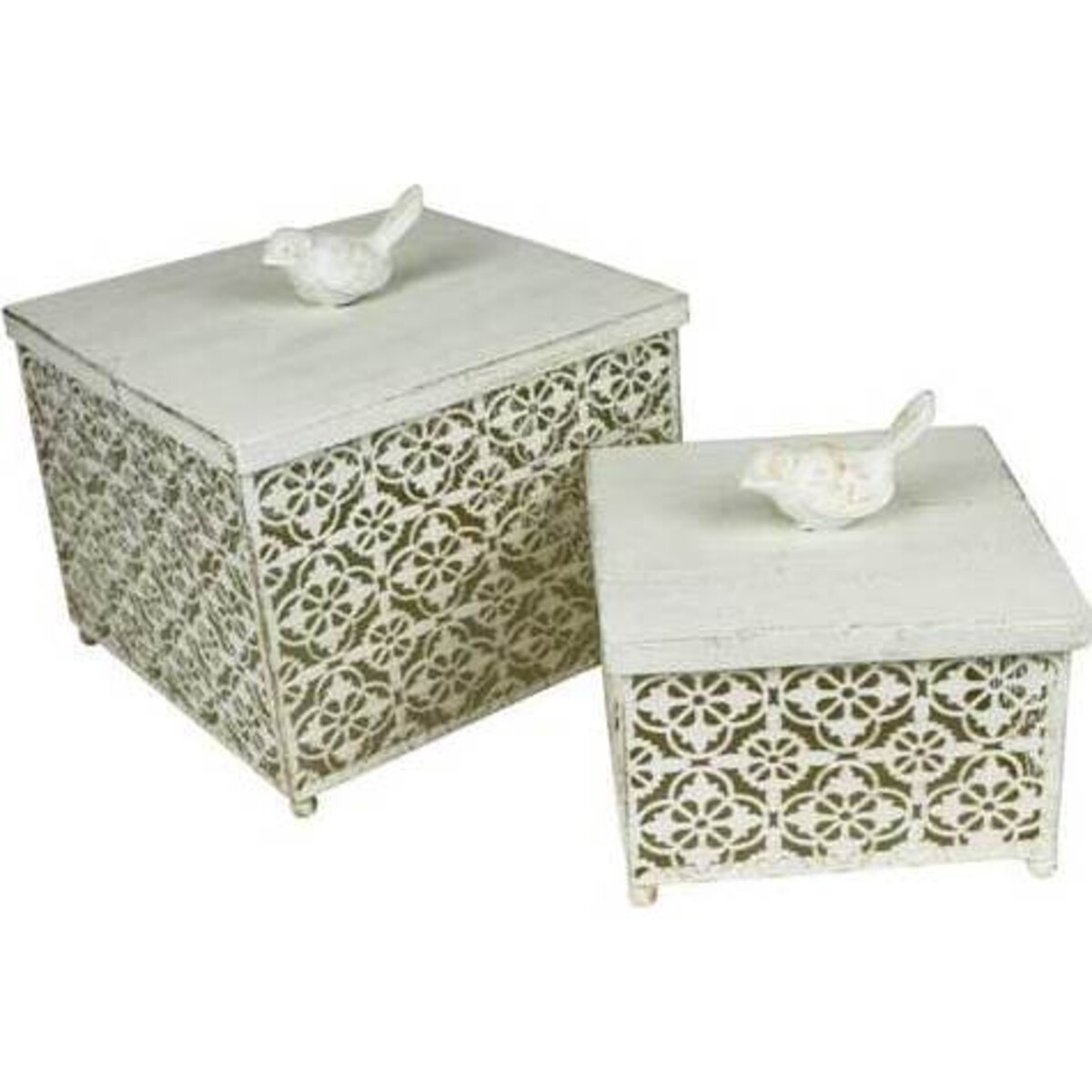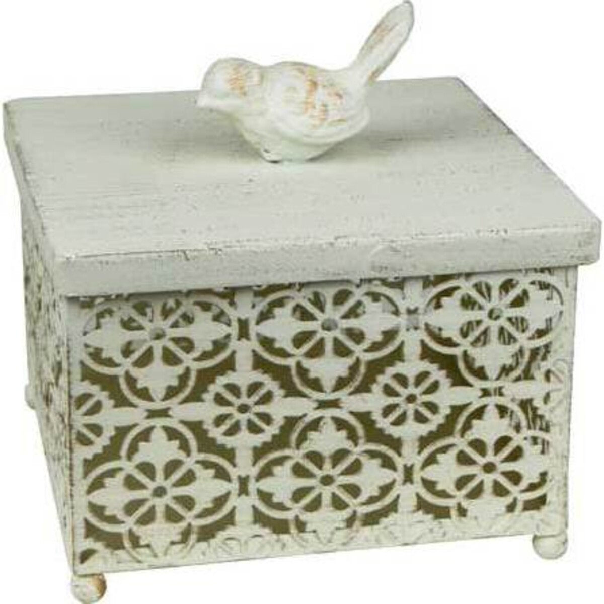 These metal boxes feature a filigree design on all sides of the base, as well as a solid lid that has a little bird sitting directly in the centre while guarding the box's contents. A little round foot sits on the bottom corner of each box to prevent the decorative accent from scratching any surfaces. From candy to jewellery, these boxes can hide a several types of items inside, and thanks to their fabulous design, they can incorporate well into a a variety of spaces.