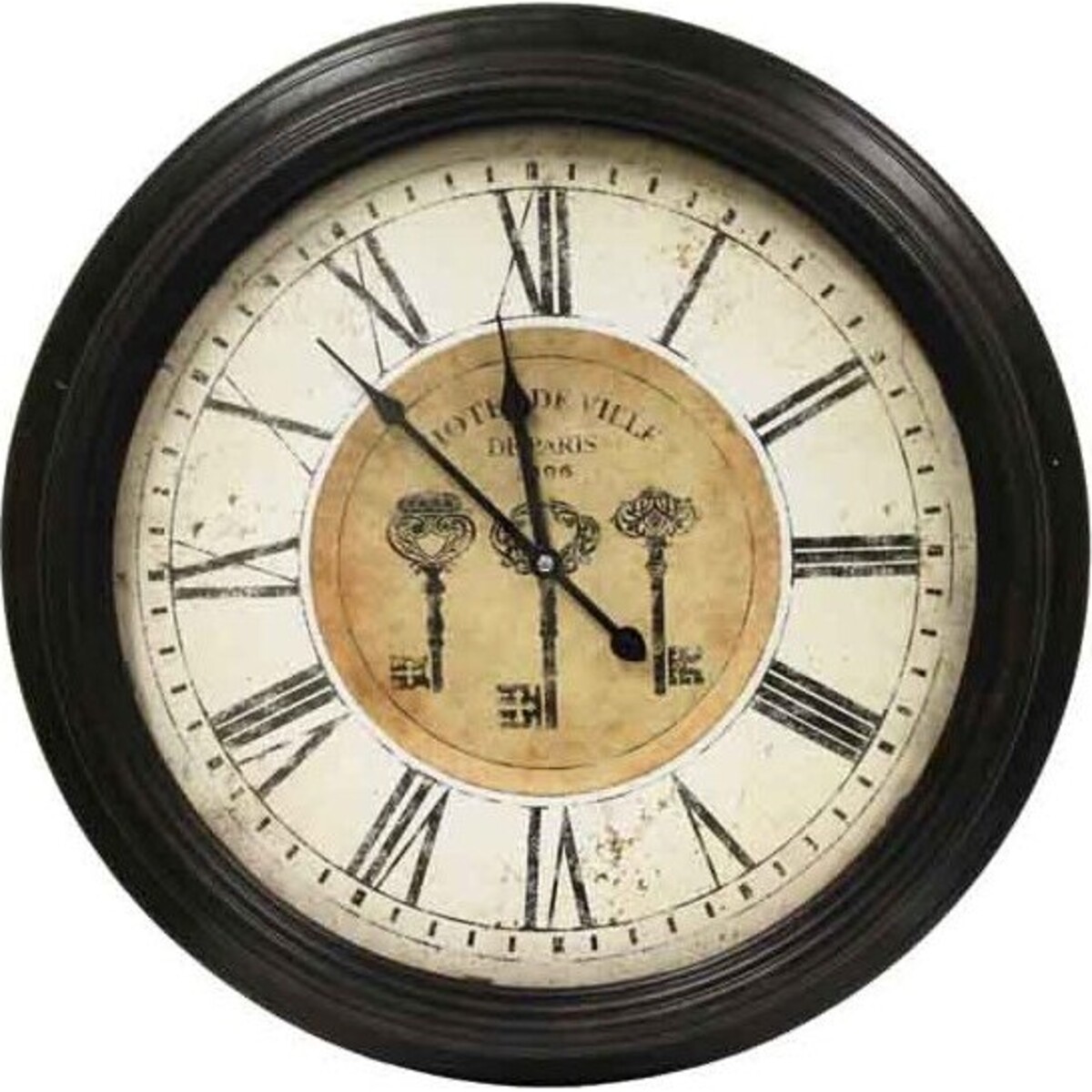 It has roman numerals in bold black hue to give it a more ancient look. The central print of the clock highlights the papyrus-like design with the text HOTEL DE VILLA DE Paris. Three big keys finish the overall aesthetics for this time-old themed timepiece.