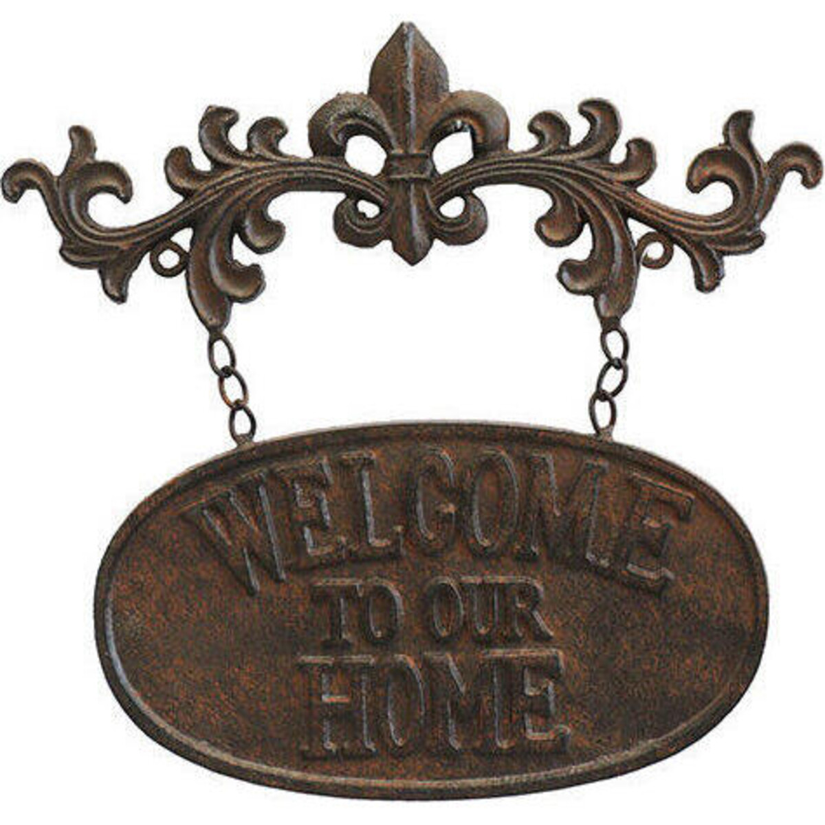 Welcoming everyone who cross the threshold of your home may not be possible verbally - and yet by adding the graceful sign such as this hanging metal one that simply says Welcome to Our home - we could be making all the difference to the way one's home welcomes it guests. Place this at the entrance of your home and make a marvellous splash of vintage charm with its gorgeous scroll design pattern and its burnished metal colour. The stem like upper bracket holds the lower roundel that hangs from two dainty chains and adds a touch of vintage chic with such a design. The 27 - cm height an d29 cm width make sit compact enough to be placed as much outside smart city apartments that wish to wear a country and manor feel vintage look as do those real country homes that naturally would be suited to it. Lend your home's entry way the touch of real warmth and hospitality with this inclusion that makes guests feel the generosity of your welcome.