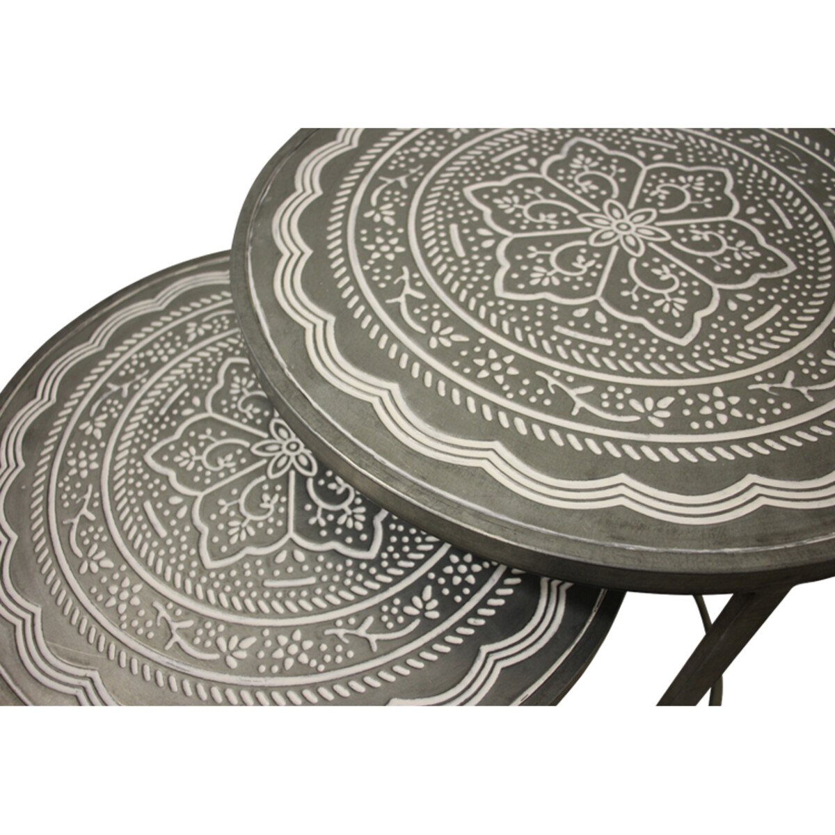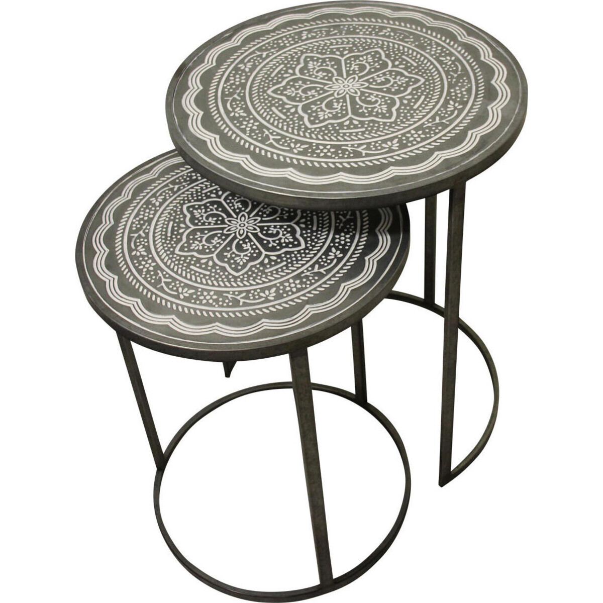 The two nested tables are inspired by the Bauhaus design?metalwork and their unique metal structure give a look that's equally modern and industrial. Its organic design consists of tabletops that sport a beautiful centric floral design, ornate patterns within concentric circles along with curve shaped borders in white and a round metal base that has a neutral colour to match any colour scheme. Ideal for small spaces, you may place these together or scatter them around your home and they'll grab eyeballs no matter where they are. Their integrated design where one table is bigger in size makes it easy to use them as a table and chair or tuck one inside the other when not in use.