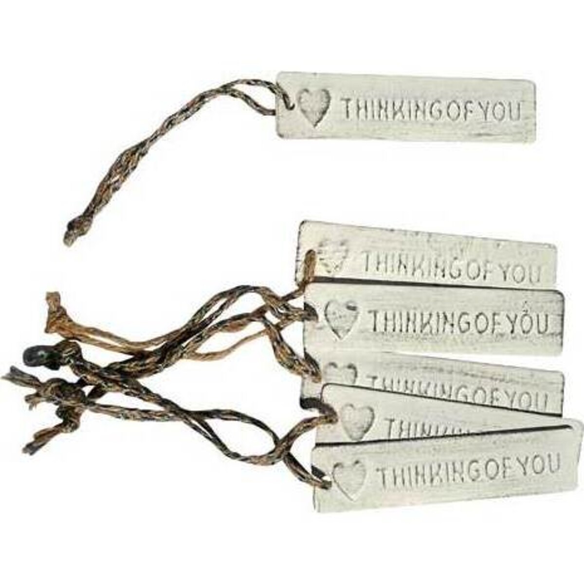 You'll get six individual tags, so there's plenty to pass out to those who need them. Each rectangle silver tag consists of the words "Thinking of You" stamped across the front with a heart stamped to the left and a dark piece of string tied at the end so you can attach it to any box or bag you wish. The best part is that while they're excellent to use for their intended purpose, they also make fabulous bookmarks.