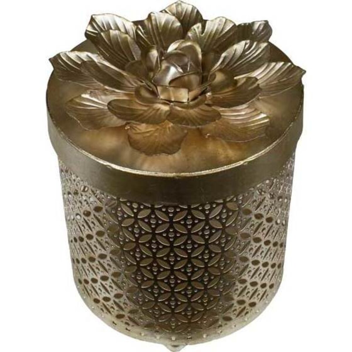 These metal tins feature a floral filigree design all over the base, as well as a large, elegantly detailed flower on the top of the lid. They have ball feet at the bottom to prevent the tin from scratching any surface. They're ideal to hold a variety of items, such as hair accessories, candy, jewellery, makeup, and a slew of other pieces you want organised and kept out of view. The size of the tins allow them to fit well into spaces of different sizes, such as on a mantel or on a dresser, and their functionality is a welcomed added bonus.