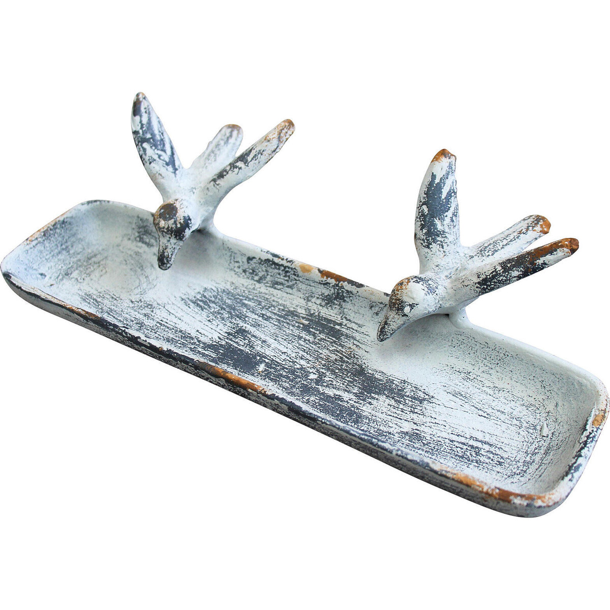Trays have a sort of versatility that is perhaps the reason why an addition of this kind makes all the sense. made from rustic and rugged metal, they tray is all of 21 cm long and has a width of 10 cm, making it rectangular, its gets its adorable look not just of its antiquated looks but also its very weathered and rustic. The tray is a dull silver colour. The tiny birds sit along the edge lending their serene kind of presence to the entire design. Use it at the console table to drop those keys or the loose change in your pocket, or use it like any other trinket tray-or simply place some of your candles and shells in a beautiful concoction of accents to completely transform its look to a greater degree of beauty. After all, with a piece as special as this, one desires to use it in so many different ways. The 21 cm long tray is about 10 cm I width with a depth that would keep things placed on it quite topple- free as well. Edges show their age and rust marks boldly thus making its effect truly vintage and shabby.